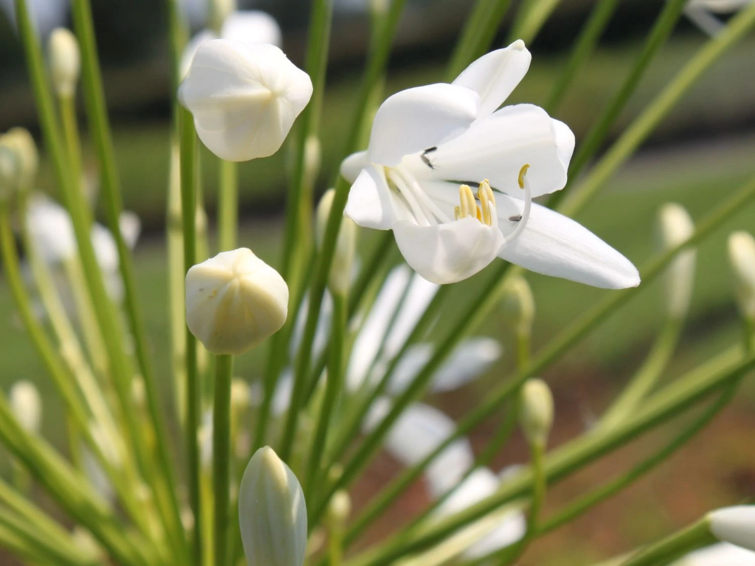 Die aufrechten Blütenstände sind maßgeblich für die Attraktivität der Staude verantwortlich. Bis zu einem Meter hoch werden die Blütenstiele der ‚Albus‘, auf den Blütendolden sind trichterförmige Blüten aus sechs gleichen Blütenblätter angeordnet. Die Blüten leuchten in einem wunderschönen Weiß, daher auch der lateinische Name ‚Albus‘ (Weiß). Im Volksmund nennt man die Pflanze Liebesblume, denn Schmucklilien galten über Jahrhunderte hinweg als Symbole der Reinheit und der Freude. Die Schmucklilie stammt ursprünglich aus dem südlichen Afrika, in Europa ist sie äußerst beliebt und wächst in Parks, Gärten und ebenso als Kübelpflanze auf den Terrassen. Mit ihrem wintergrünen Blattwerk überzeugt die Afrikanische Schmucklilie ‚Albus‘ noch einmal mehr. Damit ist sie nicht nur in der Sommerzeit, sondern auch im Winter noch eine Attraktion.