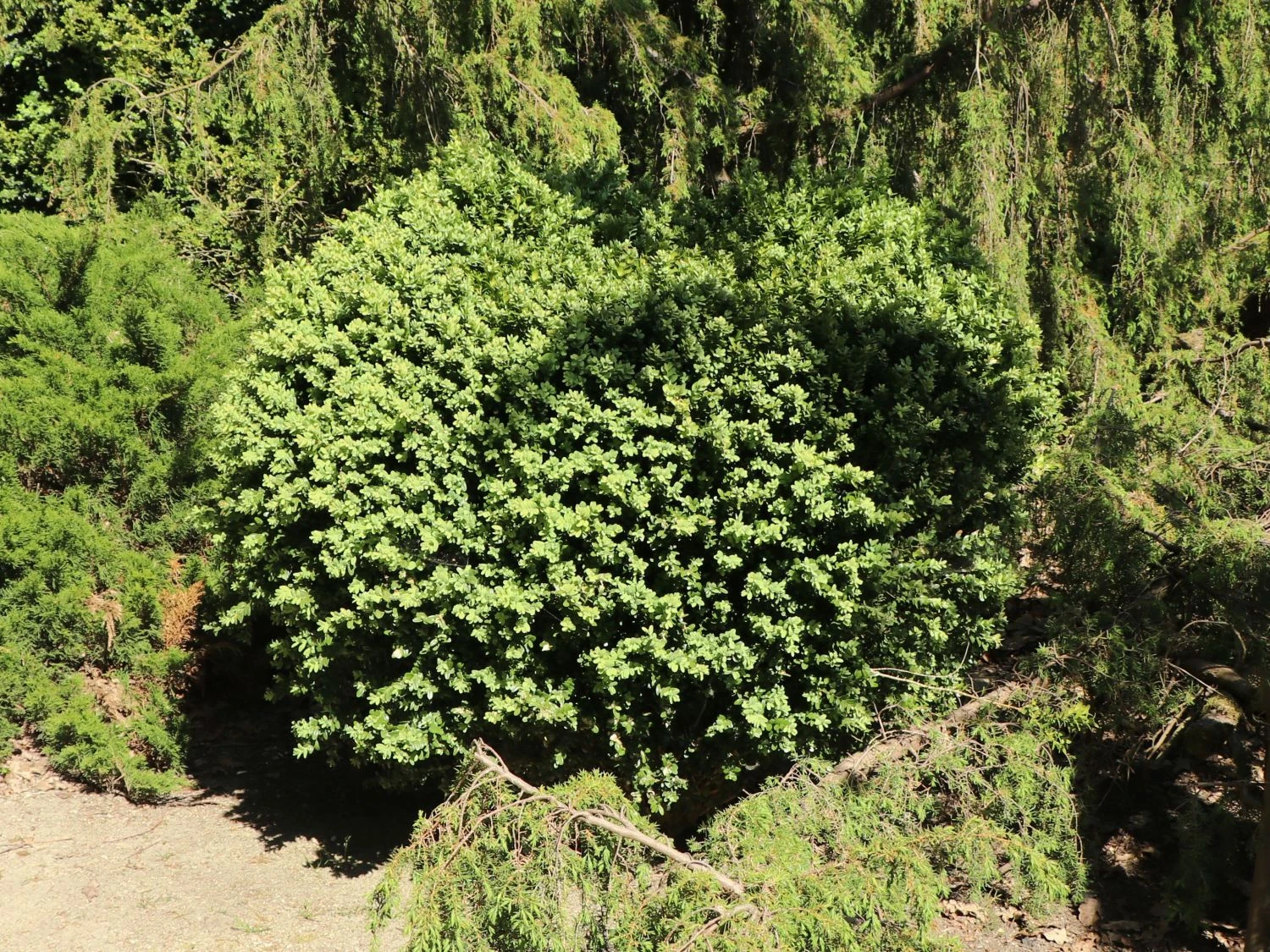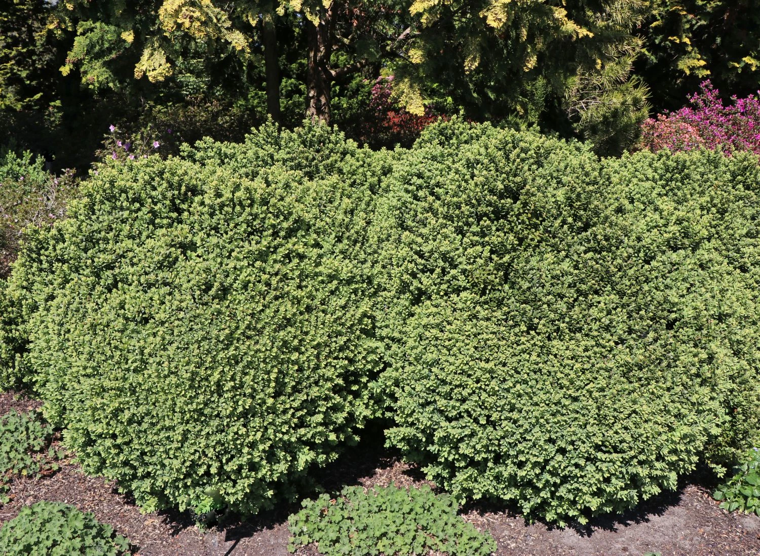 In der Wuchshöhe wie in der Breite erreicht ‚Blauer Heinz‘ 40 bis 50 cm. Mit einem Zuwachs von 4 bis 6 cm im Jahr, lässt er sich viel Zeit mit dem Wachsen. In der Sonne bis Halbschatten lebt er gerne auf normalem Gartenboden. Vielfach findet dieser Buchsbaum seinen Einsatz als einzelnes Ornament in Pflanzgefäßen oder als. Der Buchsbaum ‚Blauer Heinz‘ erlebt als Formschnittgehölz in jüngster Zeit eine Renaissance. Als Element eines formalen Gartens ist der Buchsbaum unverzichtbar. Aus barocken Schlossgärten oder Bauerngärten sind die Pflanzen dieser Art er nicht wegzudenken. Der Buxus sempervirens ‚Blauer Heinz‘ ist ein schwachwüchsiger Buchs. Kompakt wächst der Strauch als Kugel und bleibt das gesamte Jahr hindurch belaubt. Seine blaugrünen Blätter verfärben sich in den Wintermonaten dunkelgrün. Dieser Buchs stellt keine besonderen Ansprüche an den Boden. Diese robuste Pflanze ist winterhart und stadtklima- sowie industriefest. Seine vielfältigen Einsatzgebiete machen den Buxus unwiderstehlich in der Gartenkultur. Als niedrige und hohe Heckenpflanze ist er unverzichtbar. Zum Einfassen von Gräbern und Umranden von Beeten bietet sich dieser Buxus an. Die Pflanze sorgt für dekorative und ansprechende Akzente an jedem Standort. Ob wunderbar in Form gebracht oder als natürliche Kugel, er ziert jeden Standort! Dieser Buchsbaum verlangt dem Gärtner keine Pflege ab. Gemächlich vor sich hin wachsend, zeigt er seine Attraktivität als kleine Hecken- oder Solitärpflanze. Mit leichten Korrekturschnitten ist der Buxus formbar und wird zum dekorativen Ornament im Garten. Nach ausdauernden, sonnigen winterlichen Frostperioden freut sich der Buchsbaum ‚Blauer Heinz‘ über Wasser. An bedeckten Tagen während der Sommerzeit sind Formschnitte am Buxus durchführbar. Bei Hitze und während niederschlagsfreier Perioden verzichtet der Gärtner darauf. Dafür kann der Gärtner die neuen Triebe des Buxus circa um die Hälfte kürzen. Meist reicht ein Schnitt im späten Sommer aus um den Buchsbaum in Form zu halten. Die Sorte ‚Blauer Heinz‘ ist eine natürliche Mutation des Buxus sempervirens ‚Suffruticosa‘. Entstanden ist sie in den Herrenhäuser Gärten in Hannover Herrenhausen. In den 1980er Jahren entdeckte den Buxus ein Gärtnermeister namens Heinz. Auf diese Weise ist sein Name entstanden. Durch seinen extrem langsamen Wuchs, benötigt dieser wertvolle Buchsbaum wenige Rückschnitte. Alle ein bis zwei Jahre reichen aus. Im Einzelstand überzeugt ‚Blauer Heinz‘ als zauberhafte Naturkugel mit wenig Pflegebedarf.