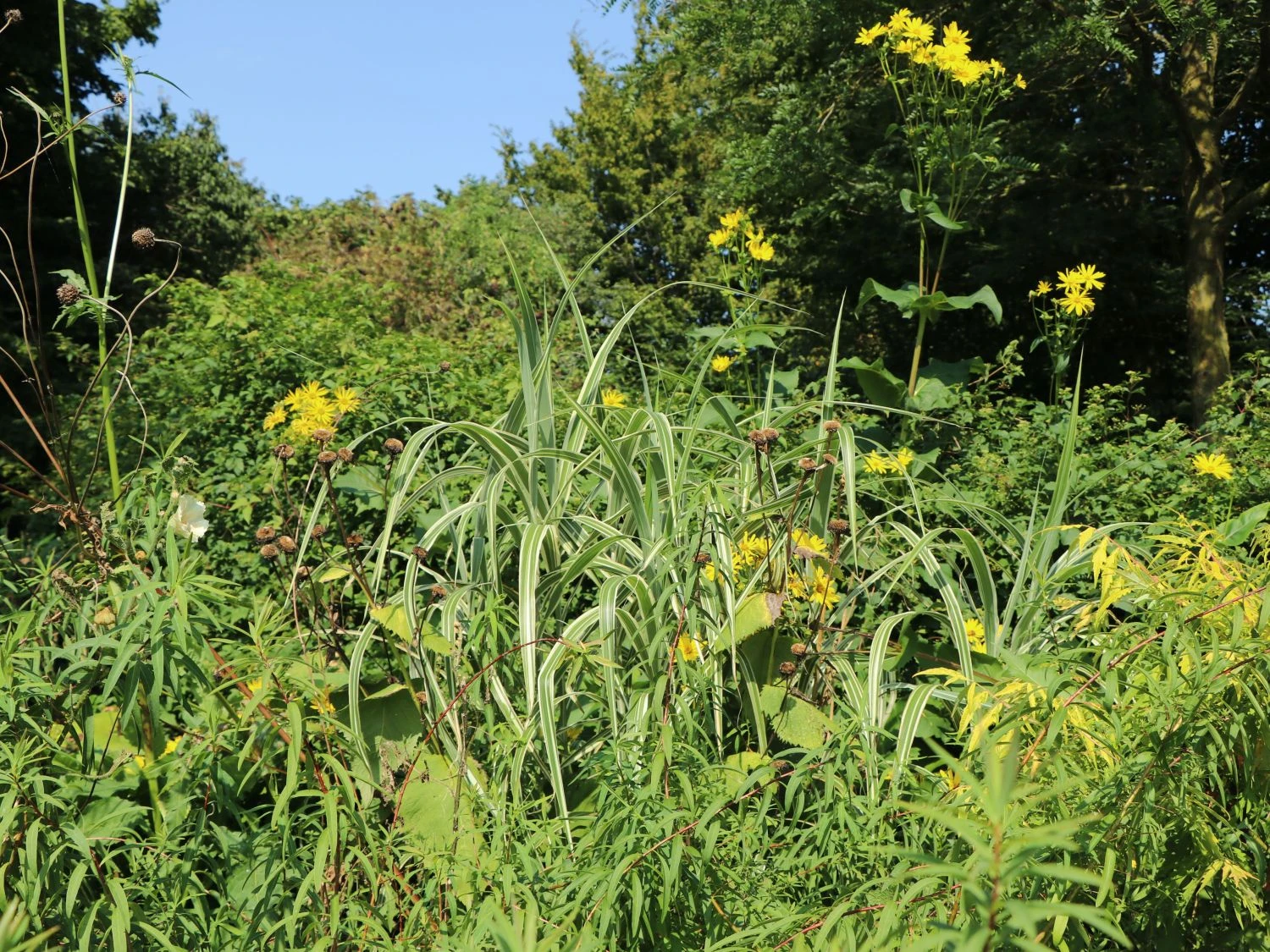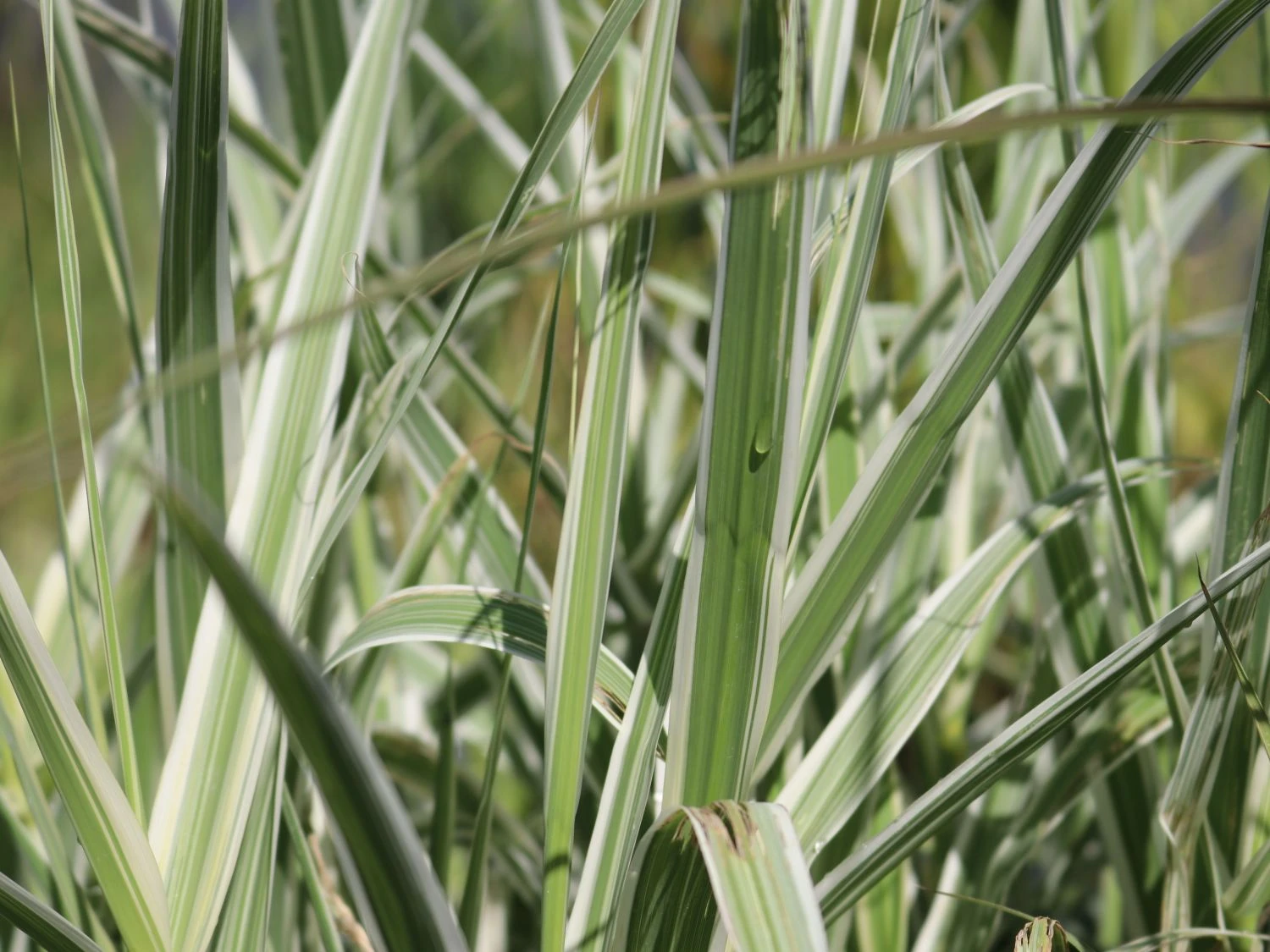 Das Buntblättrige Pfahlrohr ‚Variegata‘ eignet sich perfekt für die Bepflanzung von Freiflächen und Teichrändern. So wird der eigene Garten zu einer Oase der Ruhe und des Friedens. Das Buntblättrige Pfahlrohr mit dem botanischen Namen Arundo donax ‚Variegata‘ zählt zu den ältesten Gräsern. Es war im Altertum als ‚lakonisches Rohr‘ bekannt. Dieses wunderschöne Gras hat seinen mutmaßlichen Ursprung in Vorderasien oder Indien und fand ihren Weg in den gesamten Mittelmeerraum. Das Buntblättrige Pfahlrohr ‚Variegata‘ ist eine weiß-grüne Züchtung und zeichnet sich nicht alleine durch seine bunte Optik aus. Auch der bogig geneigte bis aufrechte Wuchs ist eine wahre Freude. Diese Sorte besticht durch besonderes Blattwerk. Es zeigt sich in weiß-grüner Färbung. Jedes einzelne Blatt ist mit mehreren weißen Längsstreifen verziert. Wunderschön anzusehen! Ein traumhafter Eindruck entsteht im Bereich von Teichanlagen. Dieses rhizombildende Gras gehört zur Familie der Süßgrasgewächse (Poaceae) und stellt neben dem Schilf die größte Süßgrasart auf europäischem Gebiet dar. Im Garten bevorzugt das Buntblättrige Pfahlrohr ‚Variegata‘ einen sonnigen Standort. Der Boden ist idealerweise wenig bis normal durchlässig, frisch bis feucht, nährstoffreich und humos. Gerade im Arrangement mit halbhohen Blütenpflanzen, ergeben sich spannende und sehenswerte Bereiche im Garten.