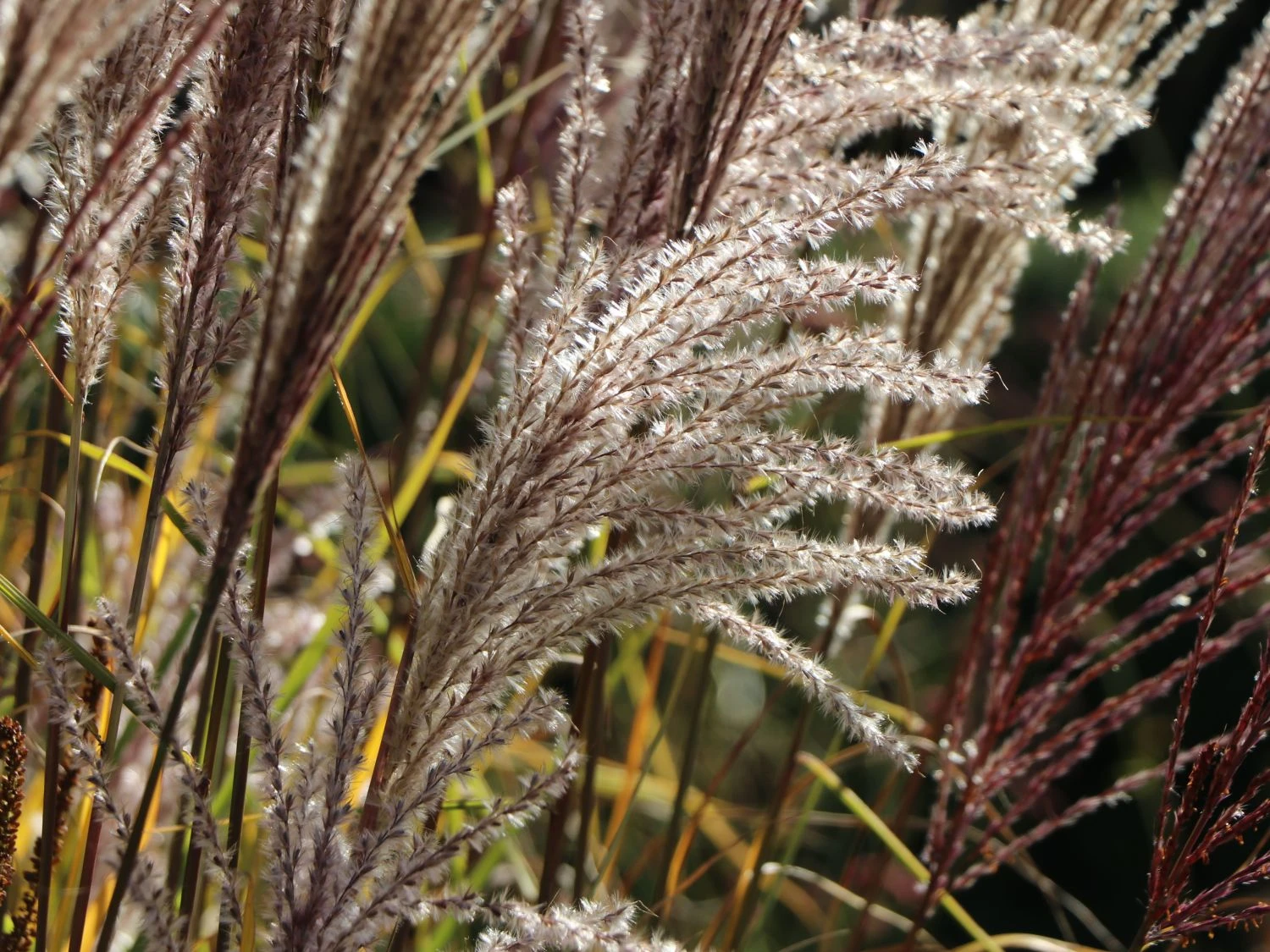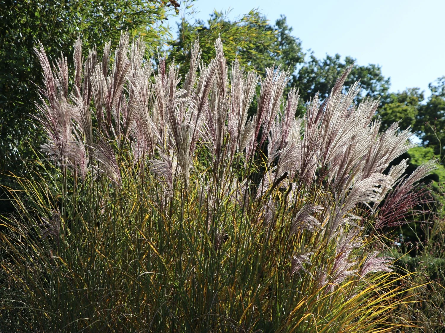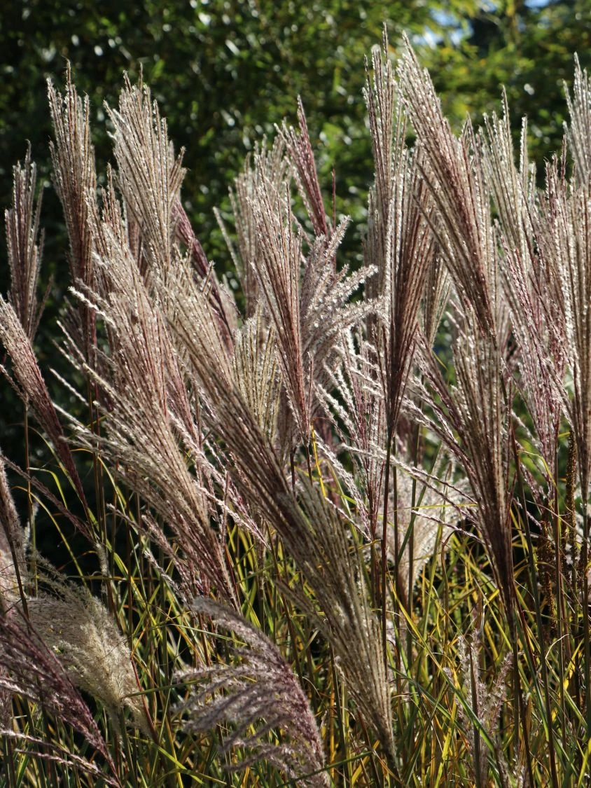 Die Miscanthus sinensis ‚Digestif‘ mit dem deutschen Namen Chinaschilf ‚Digestif‘ ist eine sehr hoch wachsende, grazil anmutende Pflanze, die bis zu zwei Meter hoch wachsen kann. Besonders auffällig sind bei dem Chinaschilf die buschigen und rötlich gefärbten Blüten, die besonders gerne zu dekorativen Zwecken eingesetzt werden aber auch als Vasenschnitt beliebt sind. Der Wuchs des Chinaschilfs ist horstartig, breitbuschig und aufrecht. Die Stängel wachsen in Holmen und werden bis zu 150 Zentimeter hoch. Die Blätter sind sehr schmal und verfügen über den schilfartigen und deutlich erkennbaren Mittelstreifen, die charakteristisch für de Chinaschilf sind.