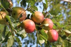 Der Herbstapfel ‚Santana‘ zeigt seine zauberhaften Blüten von April bis Mai. Die kleinen, weißen Blüten mit zartrosa überhauchten Blütenspitzen zieren die breite, buschige Krone zahlreich und sorgen für eine ertragreiche Ernte. Das sommergrüne Laub von Malus ‚Santana‘ ist oval geformt und leicht gezähnt. Die Früchte entstehen im Laufe des Sommers aus den Blüten. Sie zieren sich im Herbst mit einer grünlich-gelben Schale, die großflächig in intensivem Karmin gedeckt ist. Das mittelfeste, gelbliche Fruchtfleisch ist feinkörnig und saftig, es hat einen angenehm erfrischenden Säureanteil und einen süßen, würzigen Geschmack. Die Frucht des Herbstapfels ‚Santana‘ hat einen besonders hohen Gehalt an Polyphenolen. Das macht den Apfel auch für viele Allergiker genießbar. Die Äpfel erreichen ihre Pflückreife bereits Mitte September, genussreif sind die lagerfähigen Früchte von Oktober bis Dezember.