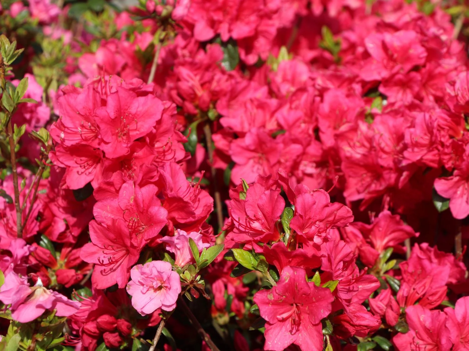 Die Japanische Azalee ‚Allotria‘ ist eine sehr schöne, großblumige Züchtung. Die Blüten sind von rosarot bis purpurrot gehalten und innen stärker rot gezeichnet. Sie blüht so reicht, dass sie mit ihrem Blütenmeer sehr dicht ihr elliptisches, glänzend dunkelgrünes Laub überdeckt.