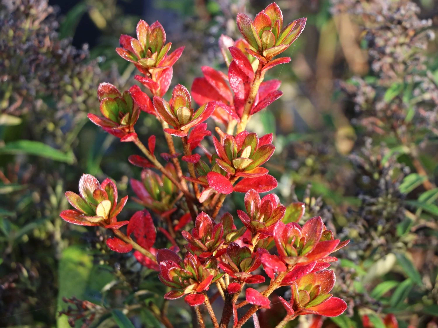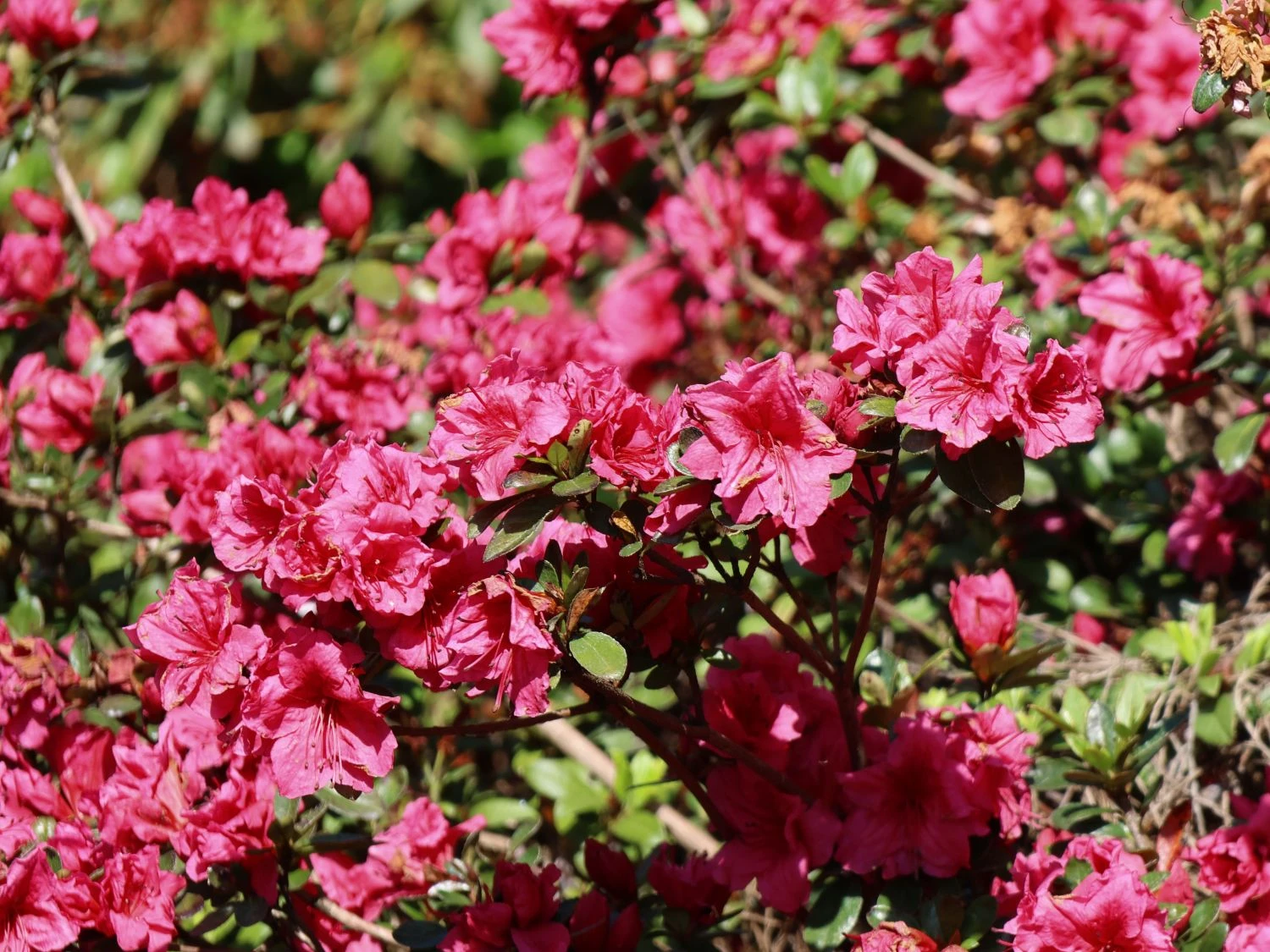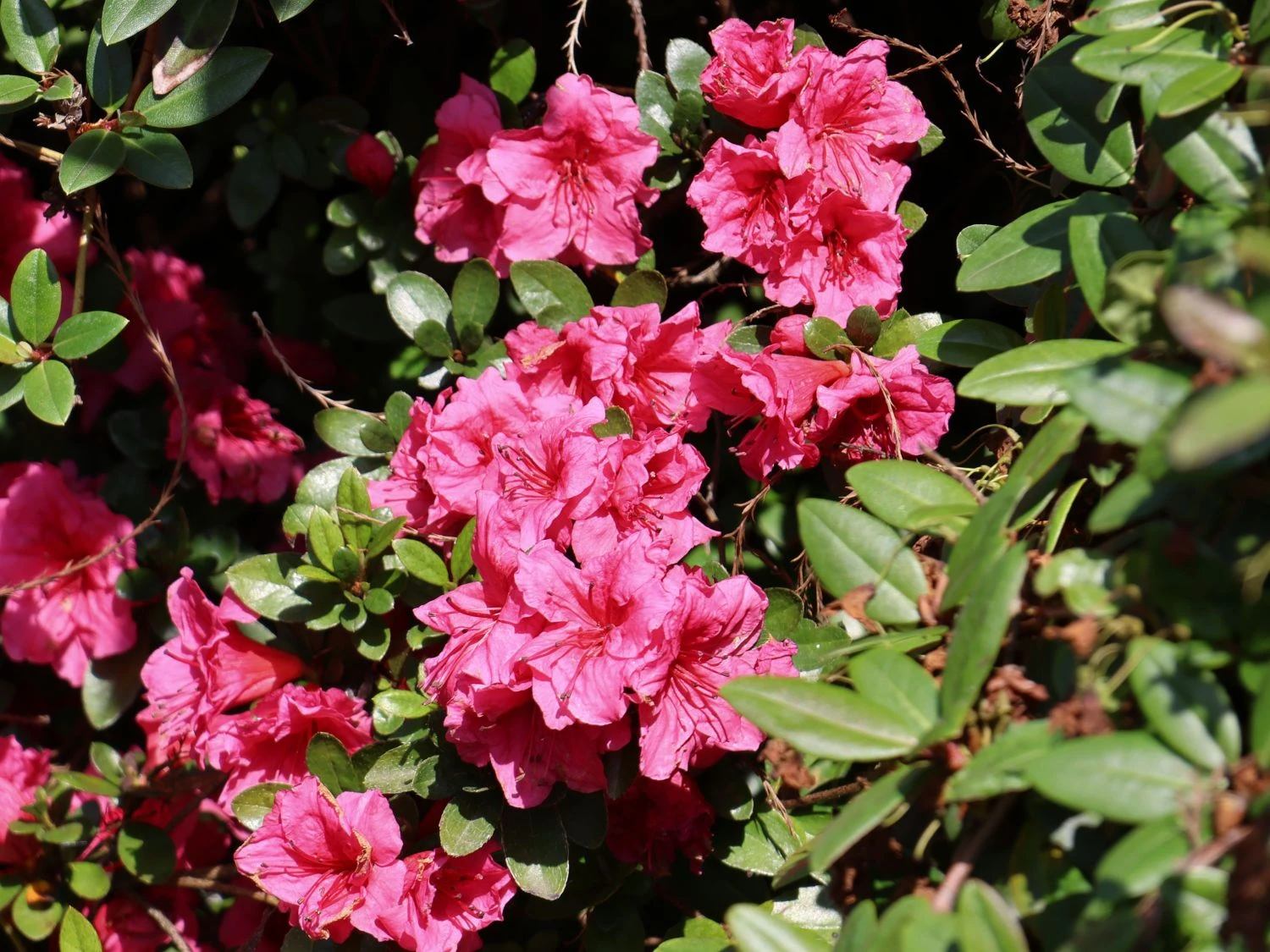 Die Japanische Azalee ‚Chipmunk‘ fasziniert mit ihren einzigartigen Blüten und dem dekorativen Laub, das den Garten das ganze Jahr über schmückt. Ihr prächtiger Flor erscheint im Zeitraum vom 6. bis zum 20. Juni. In dieser Zeit ist die gesamte Pflanze mit üppigen Blütendolden übersät. Die Einzelblüten leuchten in einem intensiven Karminrosa. Bei näherem Hinsehen überraschen sie mit einer filigranen, roten Zeichnung im oberen Bereich der Blütenblätter. Die hell funkelnden Blüten bilden einen kräftigen Kontrast zu dem glänzenden Dunkelgrün der Blätter. Rhododendron obtusum ‚Chipmunk‘ besitzt robustes, immergrünes Laub. Seine Blätter sind elliptisch geformt, weisen einen glatten Rand auf und sind vorn zugespitzt. Sie haften auch im Winter gut an den Zweigen. Die Japanische Azalee ‚Chipmunk‘ wächst flach, kompakt und dichtbuschig. Da sie sich breiter als hoch entwickelt, eignet sich sich perfekt zum Bepflanzen von Flächen. Sie erreicht eine Höhe von 30 bis 40 cm und eine Breite von 70 bis 90 cm. Jährlich legt sie um die 4 cm an Höhe und Breite hinzu.