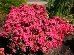 Die trichterförmigen Blüten erstrahlen in einem tiefen Rubinrosa oder in einem hellen Rot und überdecken die kleinen dunkelgrünen Blätter der Pflanze scheinbar komplett. Die wintergrünen, zwischen zwei und vier Zentimeter langen Blätter zeugen ganzjährig von Leben im Garten. Sie sind lanzettlich geformt, fest und glänzend. Die Japanische Azalee ‚Kermesina‘ wünscht sich einen leicht sauren, torfhaltigen Boden, der locker und durchlässig optimal ist. Wenn dieser Boden im Garten nicht von Natur aus vorhanden ist, bietet sich spezielle Rhododendronerde an. Rhododendron obtusum ‚Kermesina‘ fühlt sich an einem Standort in der Sonne bis Halbschatten zu Hause. Dieser Zierstrauch ist winterhart und verträgt Temperaturen bis -24 Grad Celsius ohne Schaden zu nehmen. Bei Exemplaren im Kübel achtet der Gärtner auf einen leichten Winterschutz. Dazu genügt es, das Pflanzgefäß mit Laub oder Tannenzweigen zu bedecken. Im Sommer empfiehlt es sich, regelmäßig zu gießen, um für gleichbleibend feuchtes Erdreich zu sorgen. Auch im Winter benötigt die wintergrüne Pflanze Wasser, da sie die Blätter weiterhin versorgen muss. Beim Einpflanzen ist darauf zu achten, dass das Pflanzloch nicht weniger als die doppelte Größe des Topfes hat. Auf diese Weise entfalten sich ihre Wurzeln optimal.