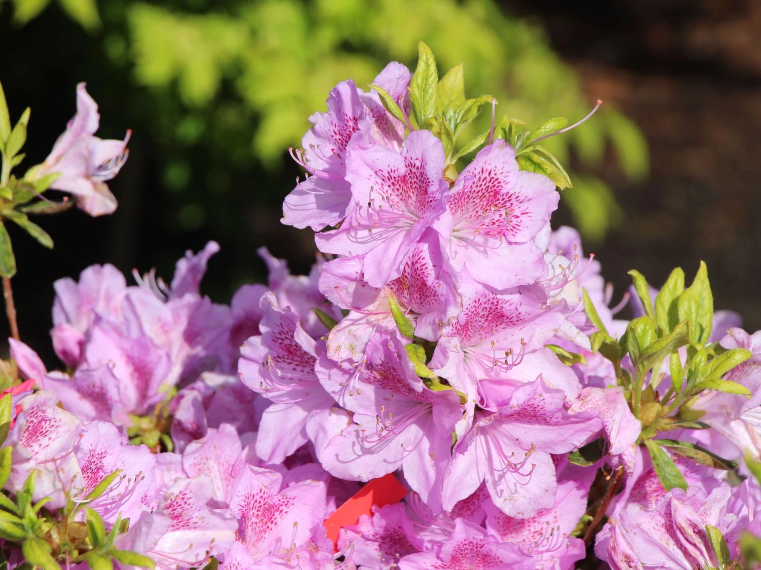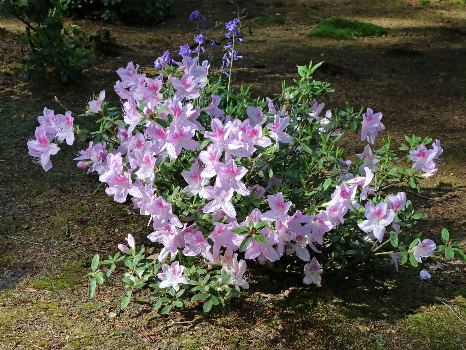 Japanische Azalee ‚Ledikanense‘ – Lila sind so einige Sorten, aber dieses spezielle Hell-lila bringt nur diese eine mit. Die weinrote Zeichnung erstreckt sich über drei innere Blütenblätter. Sie ist außerdem sehr reich blühend.