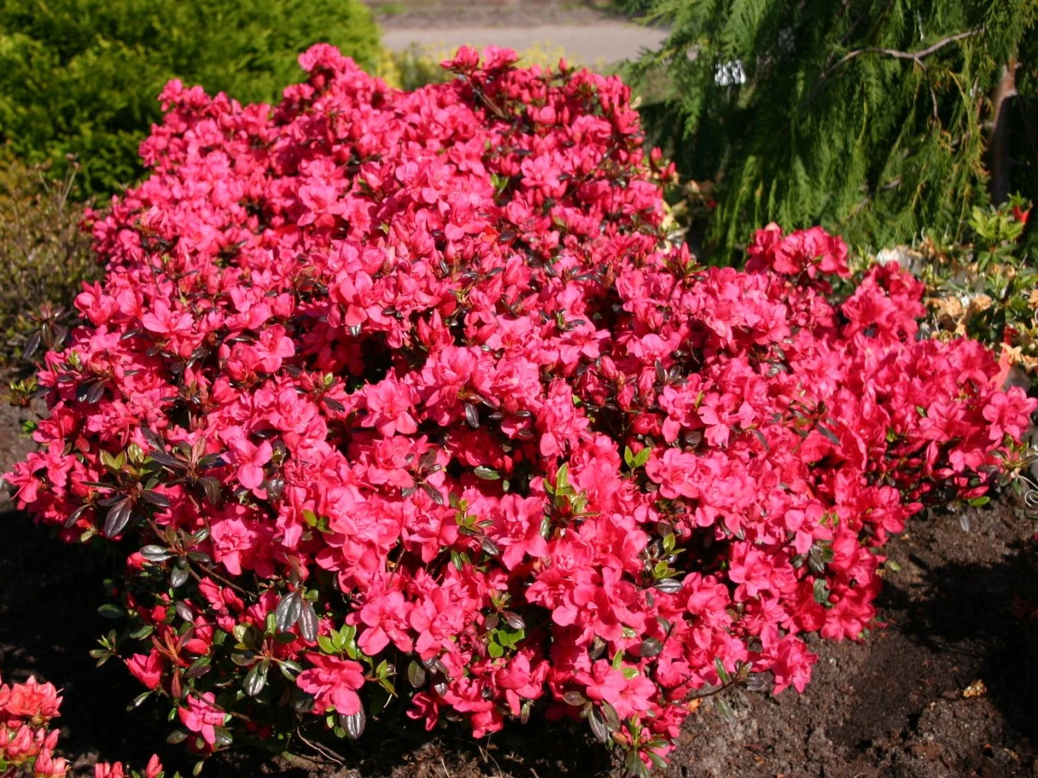 Mehrere Exemplare der Japanischen Azalee ‚Maraschino‘ ® entwickeln vor mittelhohen und hohen Rhododendren einen Blütenteppich und schließen das Moorbeet mit einem leuchtenden Band ab. Rhododendron obtusum ‚Maraschino‘ ® bildet durch seine Größe und mit seinem attraktiven Aussehen eine dekorative Pflanzendecke auf einem Grab. Er passt alleine, besser noch in einer Gruppe in einen kleinen Garten neben ein Wasserspiel. Halbhohes Farnkraut unterstreicht das kissenförmige Aussehen und die kräftigen Farben. Die Japanische Azalee ‚Maraschino‘ ® hebt sich durch Wuchsform und wechselnde Farben von anderen Azaleen ab. In das grüne Laubkleid mischen sich in den ersten Herbsttagen orange Töne. Zum Winter färben sich die Blätter in einen changierenden Bronzeton, der sich während des ganzen Winters hält. Die Blüten stehen bündelweise, in voluminösen Dolden, an den Enden der Zweige. Sie haben eine trichter- bis trompetenförmige Figur mit zwei Kreisen Blütenblättern und wirken herrlich dicht. Die Staubblätter ragen deutlich aus der kreisförmig geöffneten Blüte heraus. Blüten bilden sich ausschließlich an den neu gebildeten Zweigen des Vorjahres. Damit sich die schöne Kissenform erhält und die Pflanze viele Blüten entwickelt, schneiden Gärtner den Strauch kurz nach der Blüte zurück. Der ideale Untergrund ist feucht, locker, sauer und durchlässig.