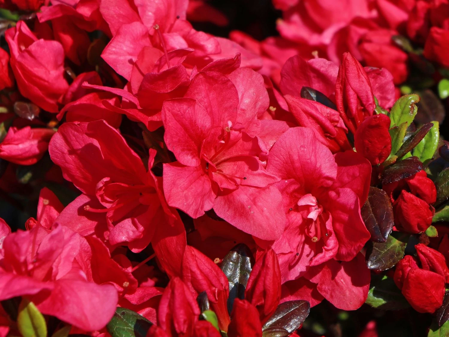 Die Japanische Azalee ‚Maraschino‘ ® entfaltet ab Anfang Mai ihre Knospen. Ab da verwandelt sich der Strauch in eine weithin leuchtende, karmesinrote Blütenkugel. (Bot.) Rhododendron obtusum ‚Maraschino‘ ® ist ein zwergenhafter Strauch und breitet seine dicht verzweigten Äste aus. Blattknospen und junge Blätter wirken im zeitigen Frühjahr wie dunkle Schokolade. In den nächsten Wochen färben sie sich in ein leuchtendes Grün und geben an allen Zweigspitzen Dolden mit Blütenknospen frei. Täglich öffnen sich neue Blüten und verlängern die Blühphase bis Ende Juni. Ideal eignet sich die Japanische Azalee ‚Maraschino‘ ® für einen einen Steingarten, in den sie zwischen Felsen, niedrigen Zypressen und Heidegewächsen intensive Farbe bringt. Der Zierstrauch wächst 40 Zentimeter in die Höhe 50 Zentimeter in die Breite.