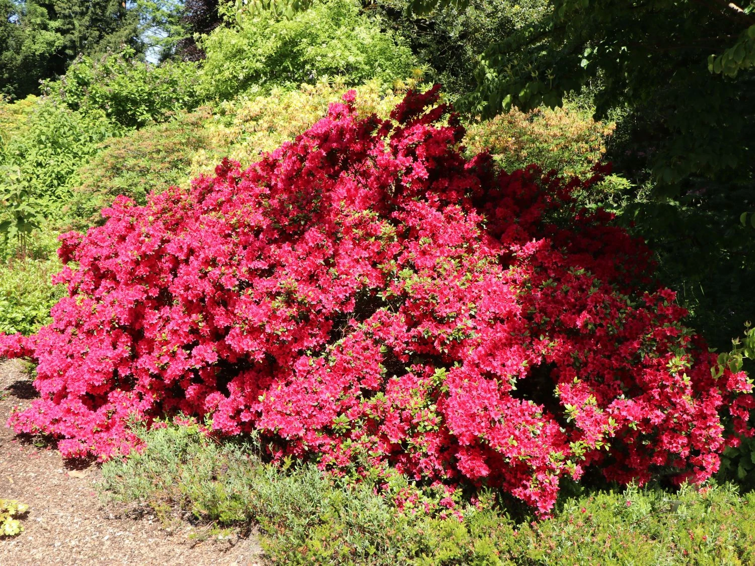 Die Japanische Azalee ‚Rubinstern‘ verwandelt den Garten zur Blütezeit in einen fulminanten Blütentraum. Überdicht bedecken rubinrote Blüten den Strauch und schenken ihm ein regelrechtes Leuchten. Wie passend, dass die Blüten sternförmig sind, denn so kam (bot.) Rhododendron obtusum ‚Rubinstern‘ zum klingenden Sortennamen. Die Blütentage dieser Sorte liegen zwischen dem 24. Mai und dem 10. Juni. Spektakulär öffnen sich die Knospen der Japanischen Azalee ‚Rubinstern‘ zu Sternen und geben den Blick auf die attraktive Zeichnung in Dunkelrot frei.