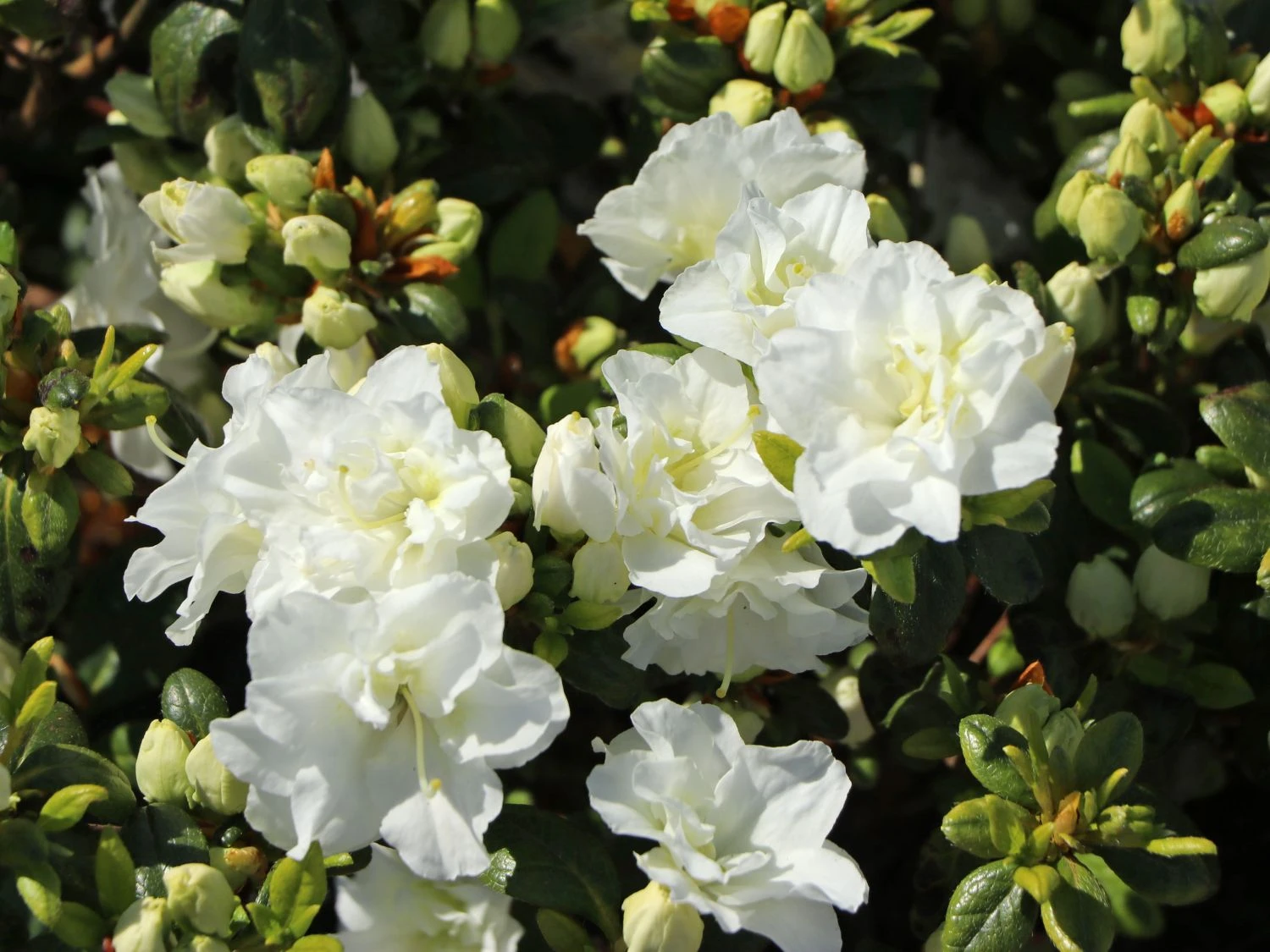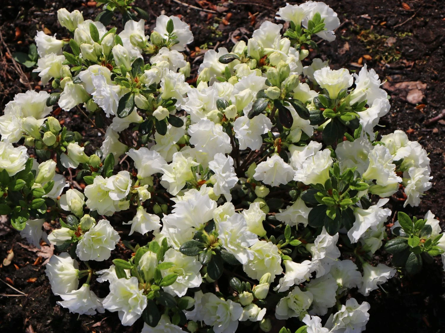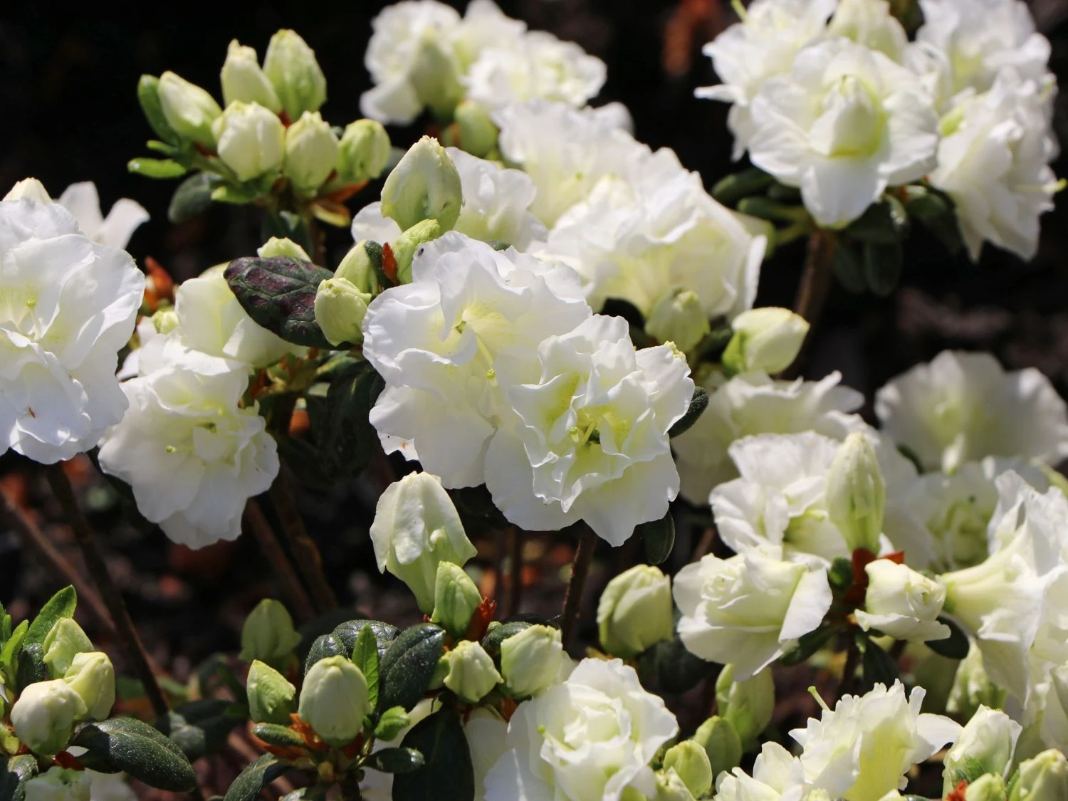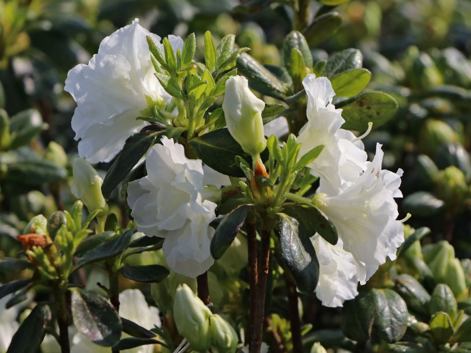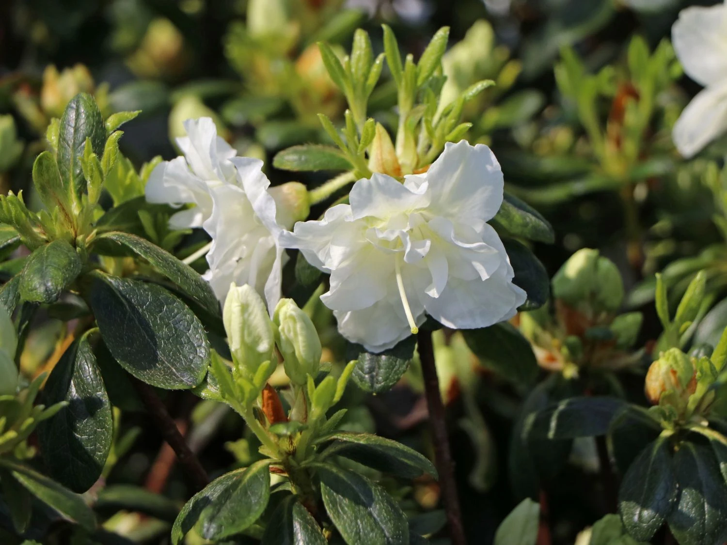 Japanische Azalee ‚Schneeperle‘ – eine herrliche Schönheit in reinweiß. Ihre Knospen entwickeln sich zu zwei trichterförmigen, geöffneten Blüten, die kleinen Rosenblüten sehr ähnlich und dicht gefüllt sind. Sie gehört außerdem zu den sehr reich blühenden Azaleen.