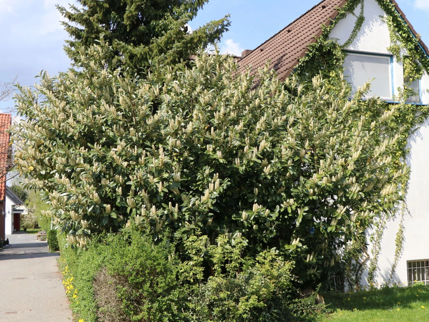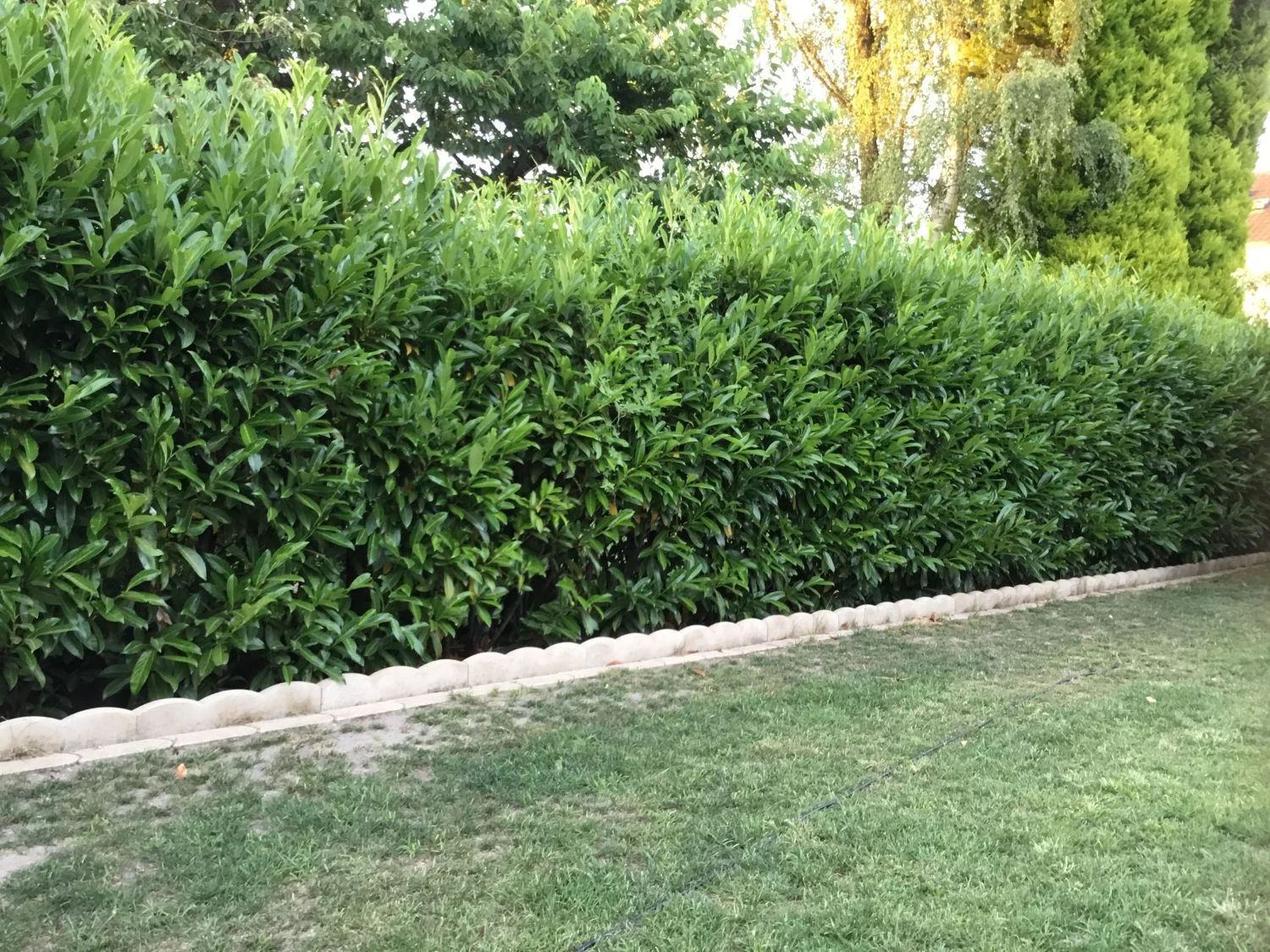 Für jeden Heckenschnitt gibt es den falschen und den richtigen Zeitpunkt. Für die Prunus laurocerasus ‚Caucasica‘ ist der falsche Zeitpunkt der späte Herbst oder Winter. Trotzdem meinen viele Gartenbesitzer gerade dann das Werkzeug herausholen zu müssen, weil ein Kirschlorbeerstrauch oder eine Kirschlorbeerhecke, die zu diesem Zeitpunkt geschnitten wird, garantiert nicht mehr austreibt und akkurat in Form bleiben wird. An diesem Argument ist etwas dran: Der Gärtner erhält im späten Herbst schöne mauerförmig geschnittene Lorbeerkirschen-Hecken, allerdings mit unschön halbierten Blättern, also mit einer zerstückelt aussehenden Oberfläche.
