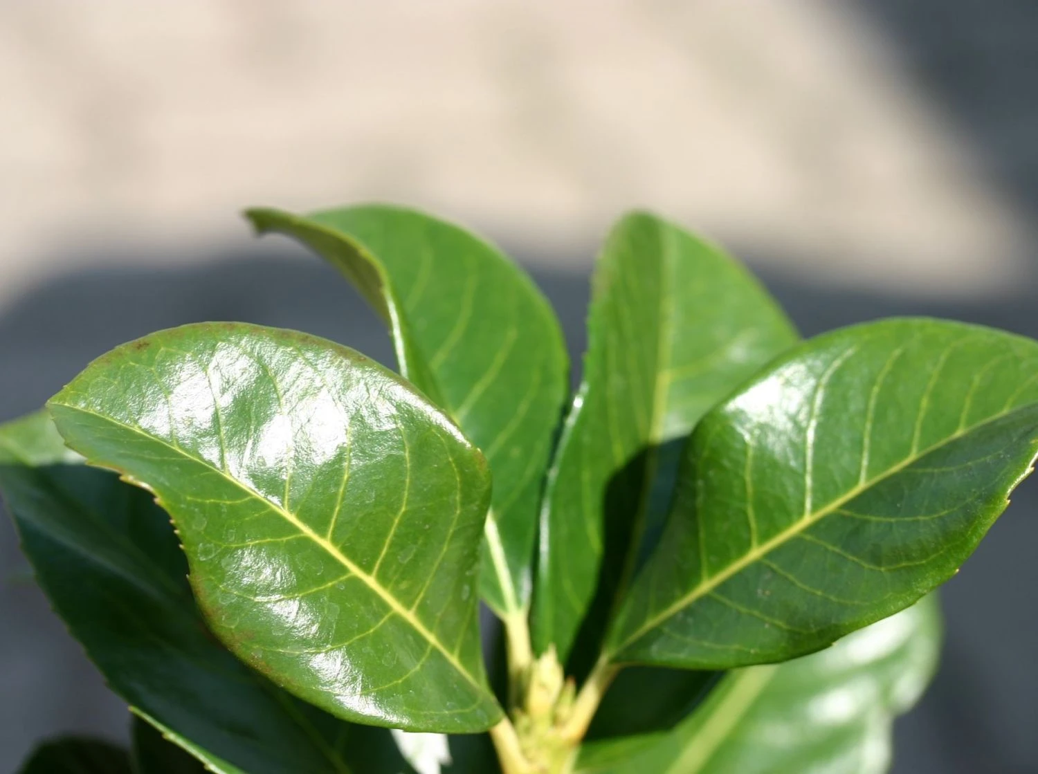Als markant präsentieren sich bei der Kirschlorbeere ‚Etna‘ ® die Blätter. Diese beeindrucken vor allem durch ihre Oberfläche, die glatt und hochglänzend ist. Die Farbvielfalt dieser Sorte reicht von mittleren Grüntönen bis zu einem saftigen Dunkelgrün. Auffällig ist der neue Austrieb, bei dem sich die Blätter dann in einem leuchtenden Bronzeton zeigen, der im Sonnenlicht dekorativ glänzt. Die nachwachsenden Blätter erscheinen als faszinierende Farbtupfer inmitten des ansonsten grünen Laubs. Ebenso die Form der Blätter zeigen charakteristische Eigenheiten. Diese präsentieren sich als breit elliptische, beinahe ovale Gebilde mit einem gezähntem Rand. Ausgeprägt sind die Blattrippen, die deutlich an der Blattoberfläche zu erkennen sind. Insgesamt erreichen die Blätter der Sorte ‚Etna‘ ® eine Größe von insgesamt 12 Zentimetern. Dabei kann eine Breite von fünf Zentimetern erreicht werden. Die Prunus laurocerasus ‚Etna‘ ® gehört zu den immergrünen Gartenpflanzen. Sie ist frosthart und kann deshalb ohne Probleme im Freien überwintern.