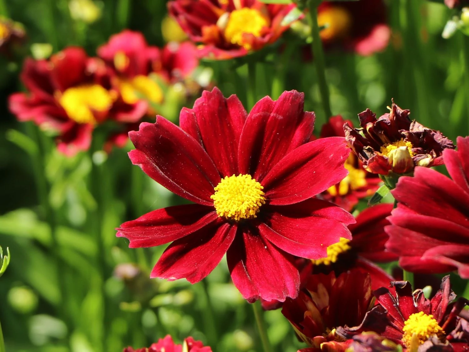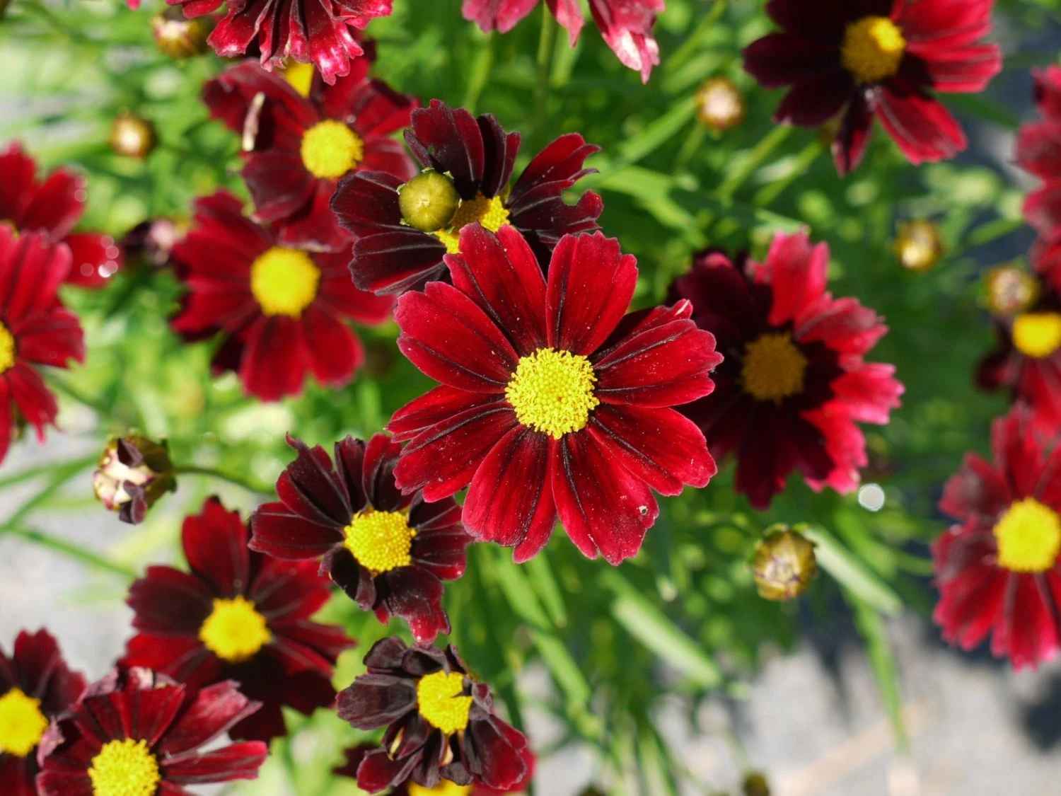 Das Mädchenauge Li’L Bang ‚Red Elf‘ bietet während seiner langen Blühphase eine wunderschöne Fülle an tief-dunkelroten Blüten. Unermüdlich schiebt (bot.) Coreopsis x cultorum Li’L Bang ‚Red Elf‘ neue Blüten nach. Bis in den Herbst hinein lässt sich dieses großartige Schauspiel verfolgen. Besonders schön wirkt das Mädchenauge Li’L Bang ‚Red Elf‘ in einer größeren Gruppe, hier wirken die dunkelroten Blüten noch auffälliger. Für einen guten Wuchs benötigt diese schöne Staude einen sonnigen Standort sowie einen nährstoffreichen, lockeren und gut durchlässigen Gartenboden. Um im nächsten Gartenjahr einen kräftigen Neuaustrieb der winterharten Staude zu fördern, ist ein Rückschnitt im Herbst zu empfehlen.