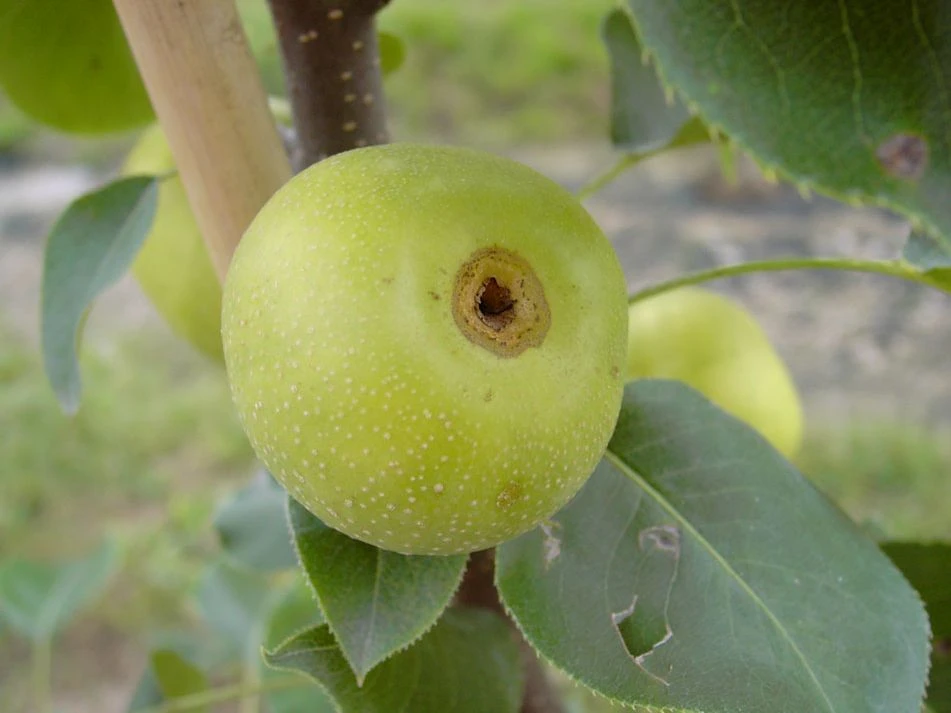 Die Nashi / Asienbirne / Asiatische Apfelbirne ‚Nijisseiki‘ (bot. Pyrus pyrifolia ‚Nijisseiki‘) verschönert den Garten. Ihre Früchte bereichern die heimische Küche. Ihre weißen Blütenstände verströmen von Anfang April bis Anfang Mai einen herrlichen, süßlich-angenehmen Geruch. Im Sommer ist der Baum der Asiatischen Apfelbirne ‚Nijisseiki‘ grün und dicht belaubt. Im Herbst bekommen die Blätter eine dekorative rötliche Färbung. Von Anfang bis Ende September ist die Frucht der Asiatischen Apfelbirne ‚Nijisseiki‘ pflückreif. Sie verspricht ab dem zweiten Standjahr eine gute, reichhaltige Ernte. Die Nashi stammt ursprünglich aus China, Japan und Korea. Derzeit wird sie in Chile, Frankreich, Deutschland, Italien, Australien, Neuseeland und den USA angebaut. Die besten Erträge sind an Standorten in sonniger bis halbschattiger Lage, in Verbindung mit humusreichen, tiefgründigen Böden zu erzielen. Ungeeignet sind Kalkböden. Der Baum der Asiatischen Apfelbirne ‚Nijisseiki‘ erreicht eine Wuchshöhe von circa fünf Metern. Die direkte Nachbarschaft von Birnenbäumen aller Art oder anderen Nashibäumen, gewährleistet die Befruchtung der Blüten. Die Früchte der Asiatischen Apfelbirne ‚Nijisseiki‘ sind mittelgroß. Sie sind rund und haben eine glatte, hell gelbgrüne Schale. Das Fruchtfleisch ist weiß, knackig und fest. Der Geschmack ist erfrischend, köstlich, aromatisch. Die Frucht enthält Vitamin C, Kalium, Phosphor, Eisen und Calcium und ist, dank dieser Inhaltsstoffe, ein absolut gesundes Lebensmittel.