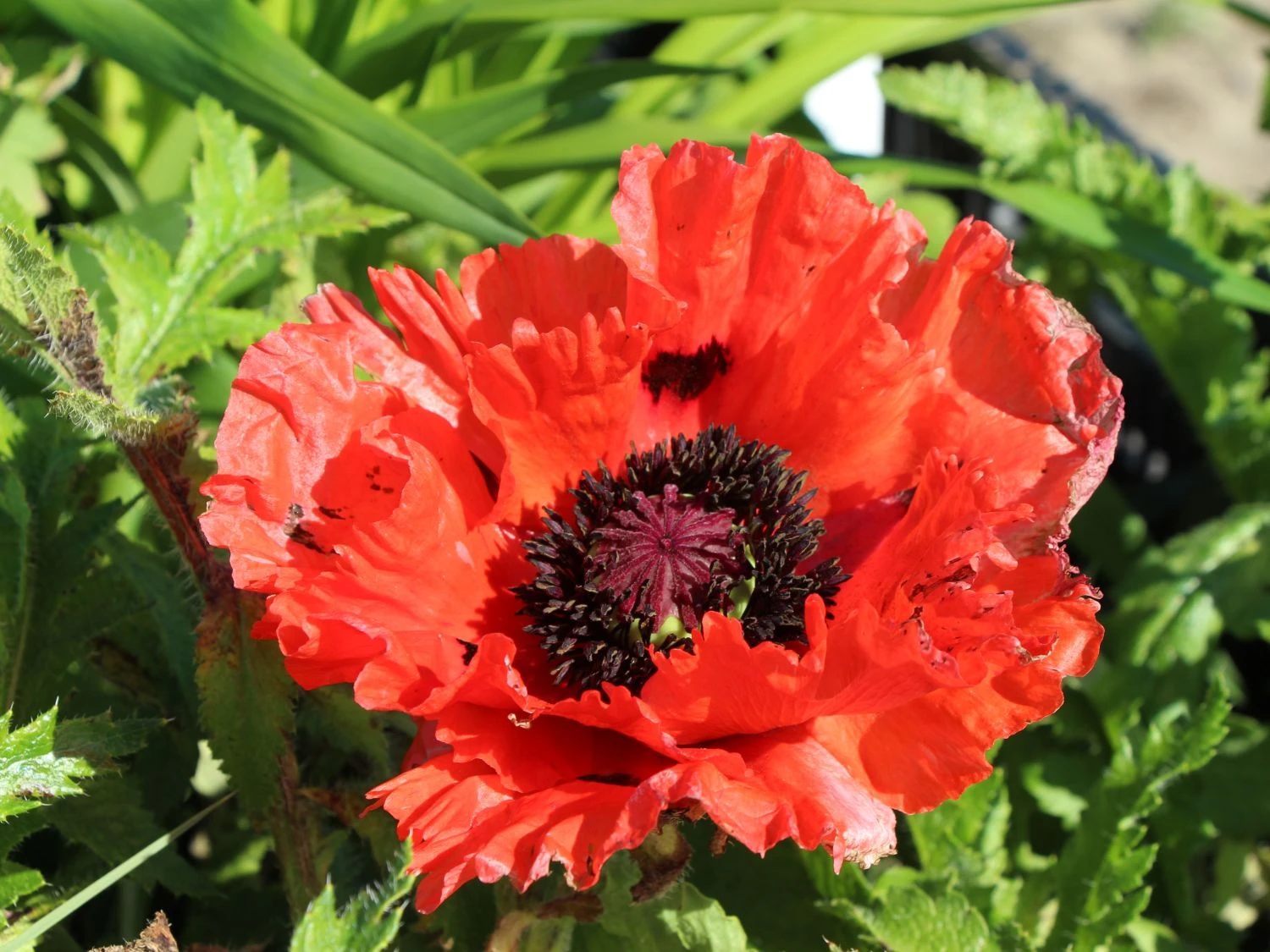 Eher klassisch präsentieren sich die leuchtend roten Blüten des Orientalischen Garten-Mohns ‚Türkenlouis‘. Sie tragen ein schwarzes Auge, die Ränder sind stark geschlitzt und ausgefranst.