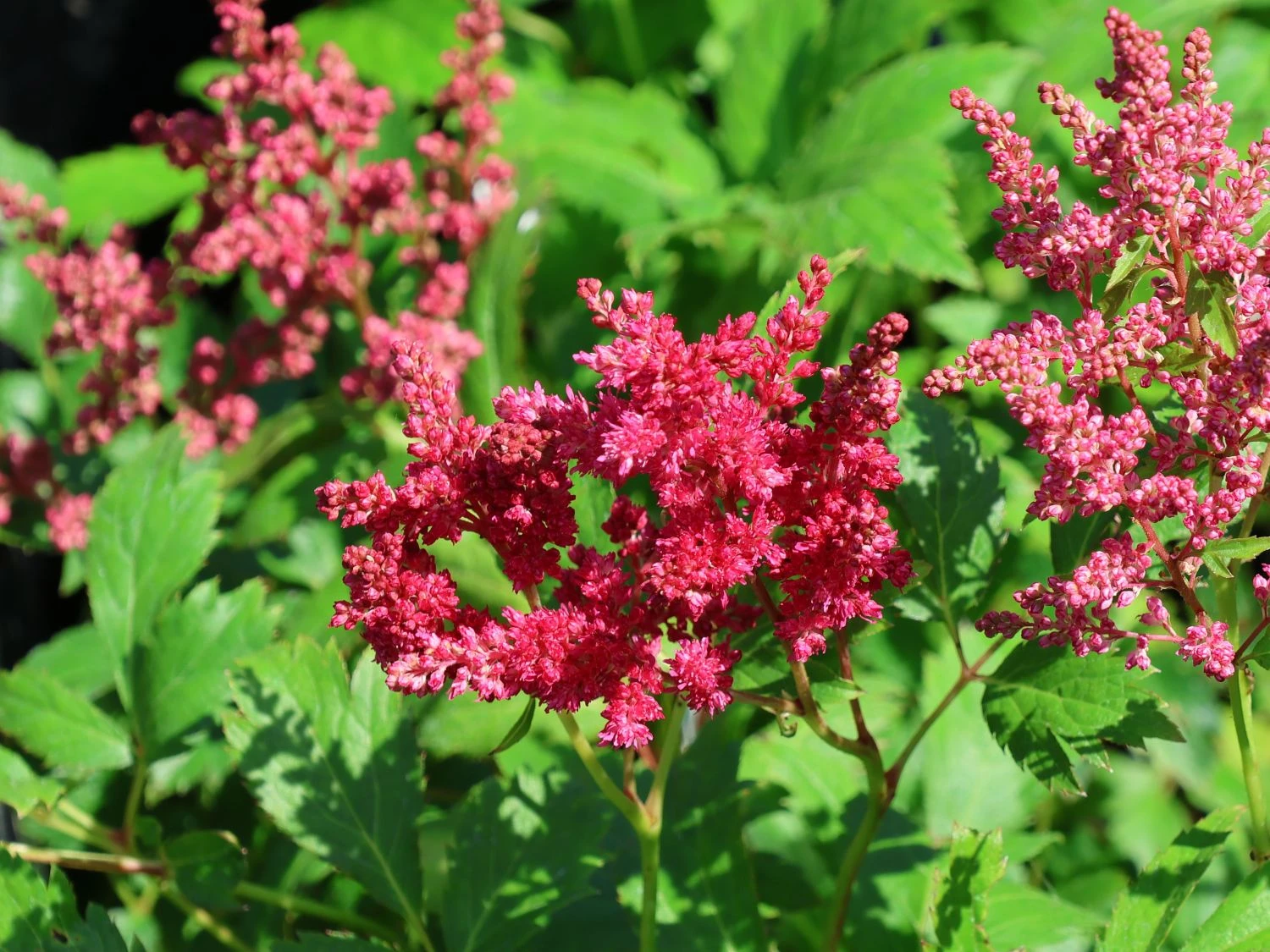 Die Prachtspiere ‚Younique ® Fireberry‘ betört mit ihren herrlichen roten Blüten das Auge und lockt unzählige hungrige Insekten in den Garten. Besonders Honigbienen sind begeisterte Besucher der mit Nektar gefüllten Blüten von (bot.) Astilbe japonica ‚Younique ® Fireberry‘. Zu den roten Blüten gesellt sich das ansehnliche dunkelgrüne Laub. Die Blätter haben einen schönen Glanz und sind filigran gefiedert. Sie bieten einen geschmackvollen Kontrast zu den roten Blüten. Diese schöne Staude wächst aufrecht und erreicht eine Höhe von 20 bis 30 Zentimeter. Die Prachtspiere ‚Younique ® Fireberry‘ fühlt sich am besten in den halbschattig bis schattig gelegenen Bereichen des Gartens aufgehoben. Dort genießt sie es, ihre Wurzeln in einen nährstoffreichen, frischen bis feuchten und durchlässigen Erdboden auszustrecken.