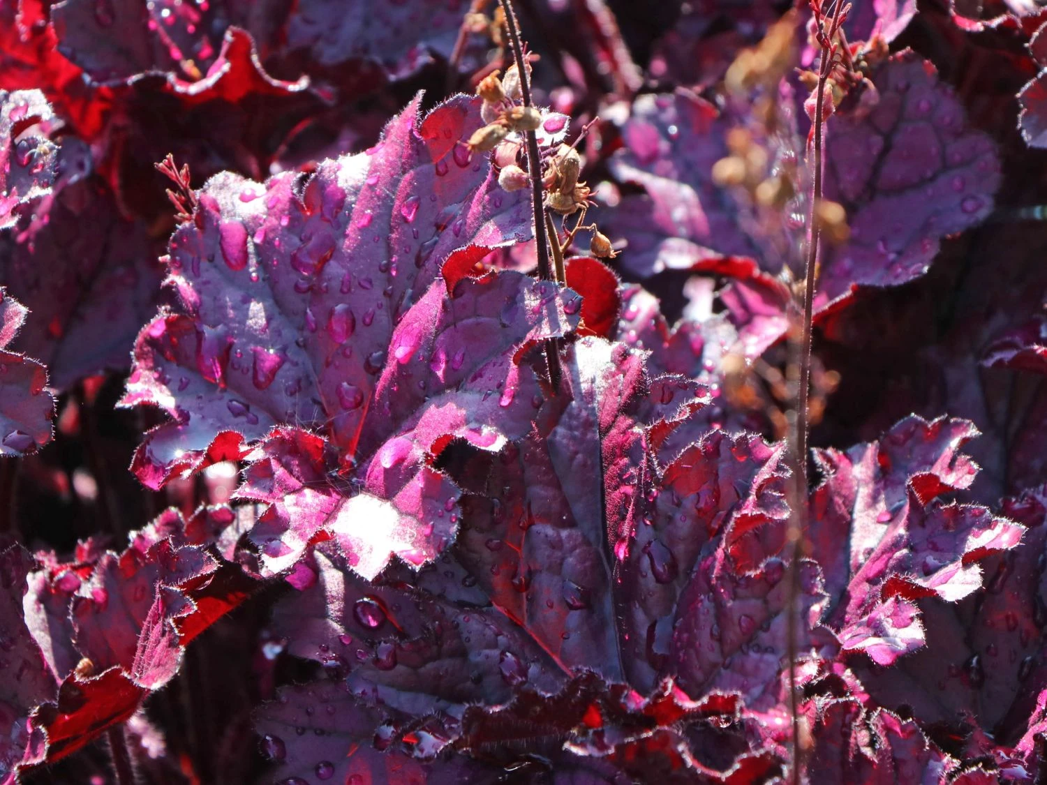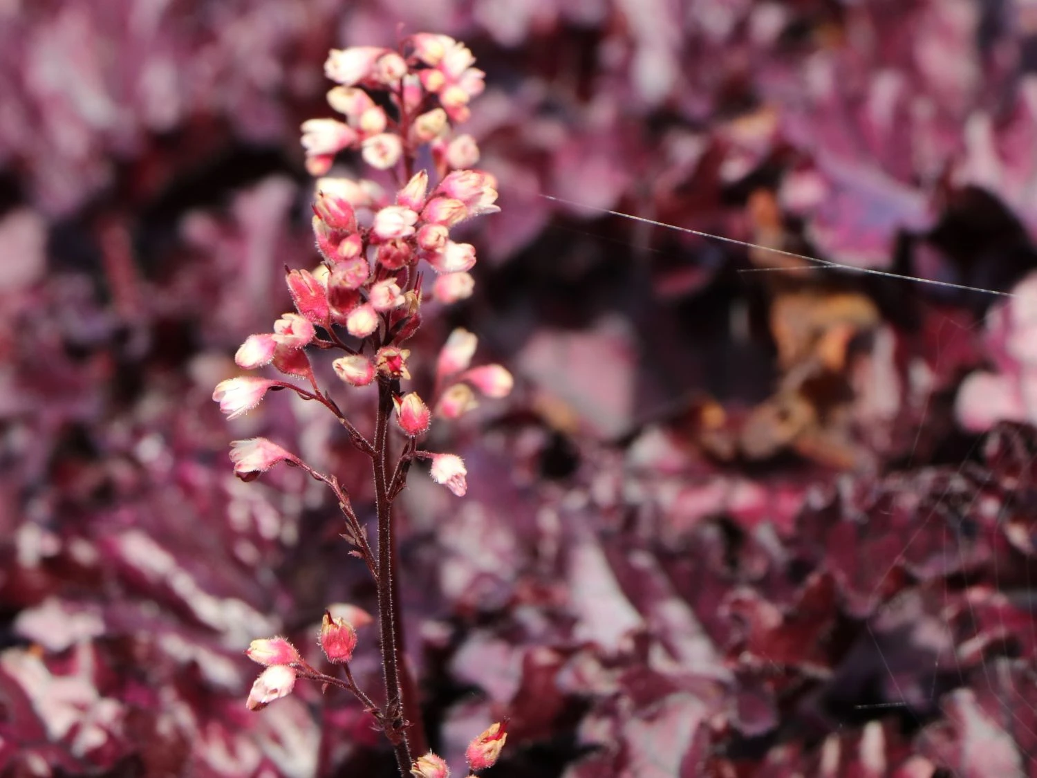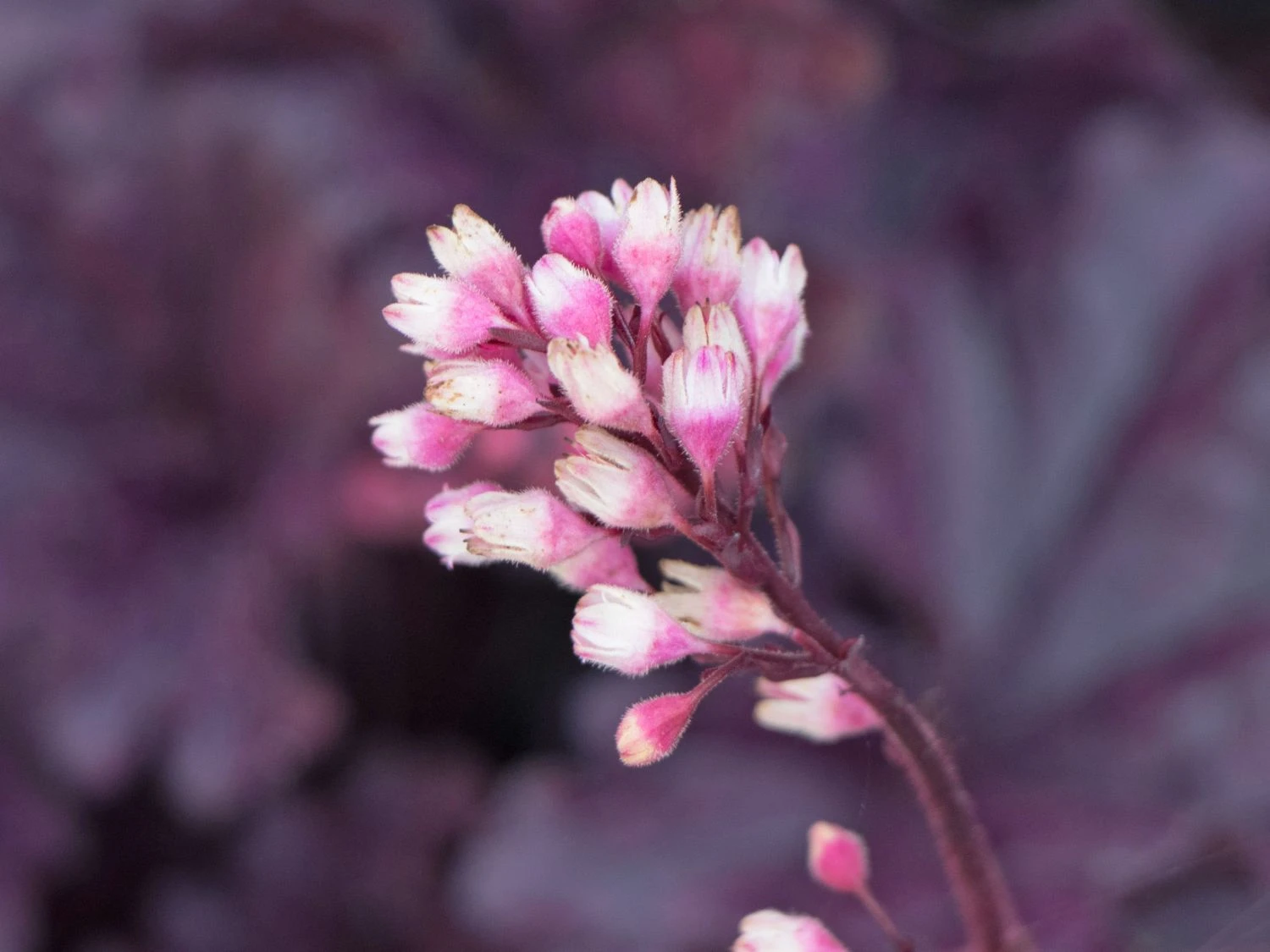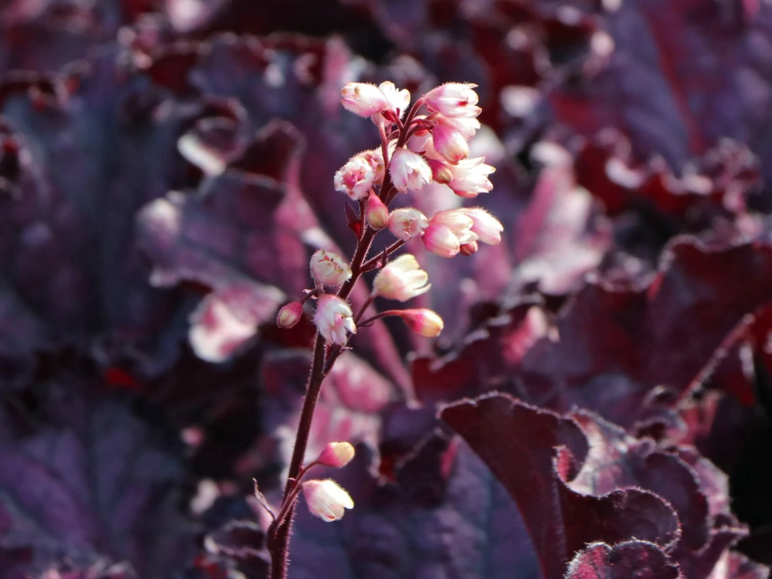 Das Purpurglöckchen ‚Forever Purple‘ ist eine spektakuläre Staude, deren Blätter bewundernde Blicke auslösen. Es müssen nicht immer Blüten sein: die schöne (bot.) Heuchera x cultorum ‚Forever Purple‘ beweist, dass sich mit Blattschmuckpflanzen für aufregende Szenerien im Staudenbeet oder am Gehölzrand eignen. Das Schöne an ‚Forever Purple‘ ist, dass dieses Purpurglöckchen auch im Winter seine traumhaft schönen Blätter präsentiert. Sie glänzen elegant und changieren zwischen purpurroten und violetten Farbnuancen. Nicht nur die Blätter sind beeindruckend, auch die rosa Blütenrispen sind ein Blickfang.