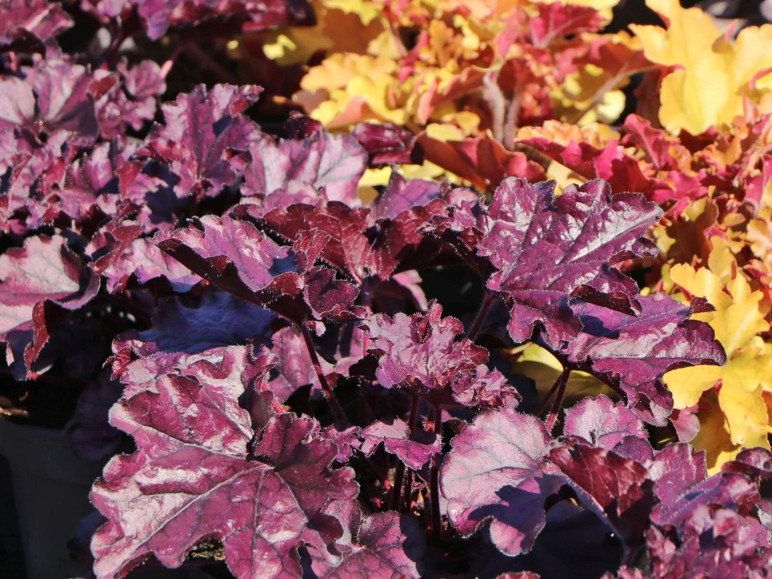 ‚Forever Purple‘ fügt sich wunderbar in Staudenbeete ein und schmückt Steingärten, Pflanztröge und Dachterrassen. Auch auf Freiflächen sowie am Gehölzrand setzt die anmutige Staude dekorative Akzente, in dem sie Farbe unter Sträucher oder Bäume bringt. Heuchera x cultorum ‚Forever Purple‘ ist gut winterhart und mehrjährig. In Kübeln ist diese farbenprächtige Staude mit weiß blühenden Pflanzen ein wunderschöner Hingucker. Vorgärten oder Töpfe im Eingangsbereich setzt das Purpurglöckchen ‚Forever Purple‘ auch im Winter apart in Szene. Die großen Blätter sorgen mit ihren Farbnuancen für einen tollen Kontrast. Das Lila ist intensiv, die glänzende Oberfläche der Blätter hebt die Leuchtkraft magisch hervor. Die Blätter sind am Rand gekräuselt und schick gelappt.