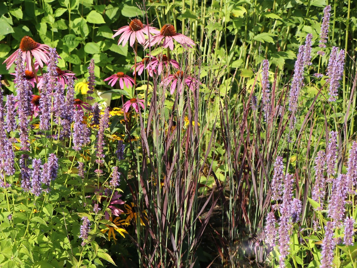 Die Ruten-Hirse ‚Purple Breeze‘ ist eine zierlich und aufrecht wachsende Staude, die an jeder Stelle für einen schönen Anblick sorgt. Dieses liebenswerte Ziergras lässt sich wunderbar mit höher wachsenden Präriestauden kombinieren und kommt in einer solchen Bepflanzung neben Indianernessel, Sonnenhut oder Prachtkerze hervorragend zur Geltung. Der späte Austrieb von (bot.) Panicum virgatum ‚Purple Breeze‘ liegt darin begründet, dass dieses Gras die Wärme liebt und erst mit steigenden Temperaturen seine Energie ins Höhenwachstum steckt. Diese sogenannten “Warm-Season-Gräser“ lieben die warmen Lagen und erfreuen ganzjährig mit ihrer dekorativen Austrahlung. Die Ruten-Hirse ‚Purple Breeze‘ bevorzugt einen nicht allzu trockenen Boden, der nährstoffreich, aber nicht überdüngt ist. Ein Zuviel an Dünger führt zum Umfallen der Blütentriebe, da sie ihrem eigenen Gewicht dann nicht mehr standhalten können. Die Rutenhirse war Staude des Jahres 2020.