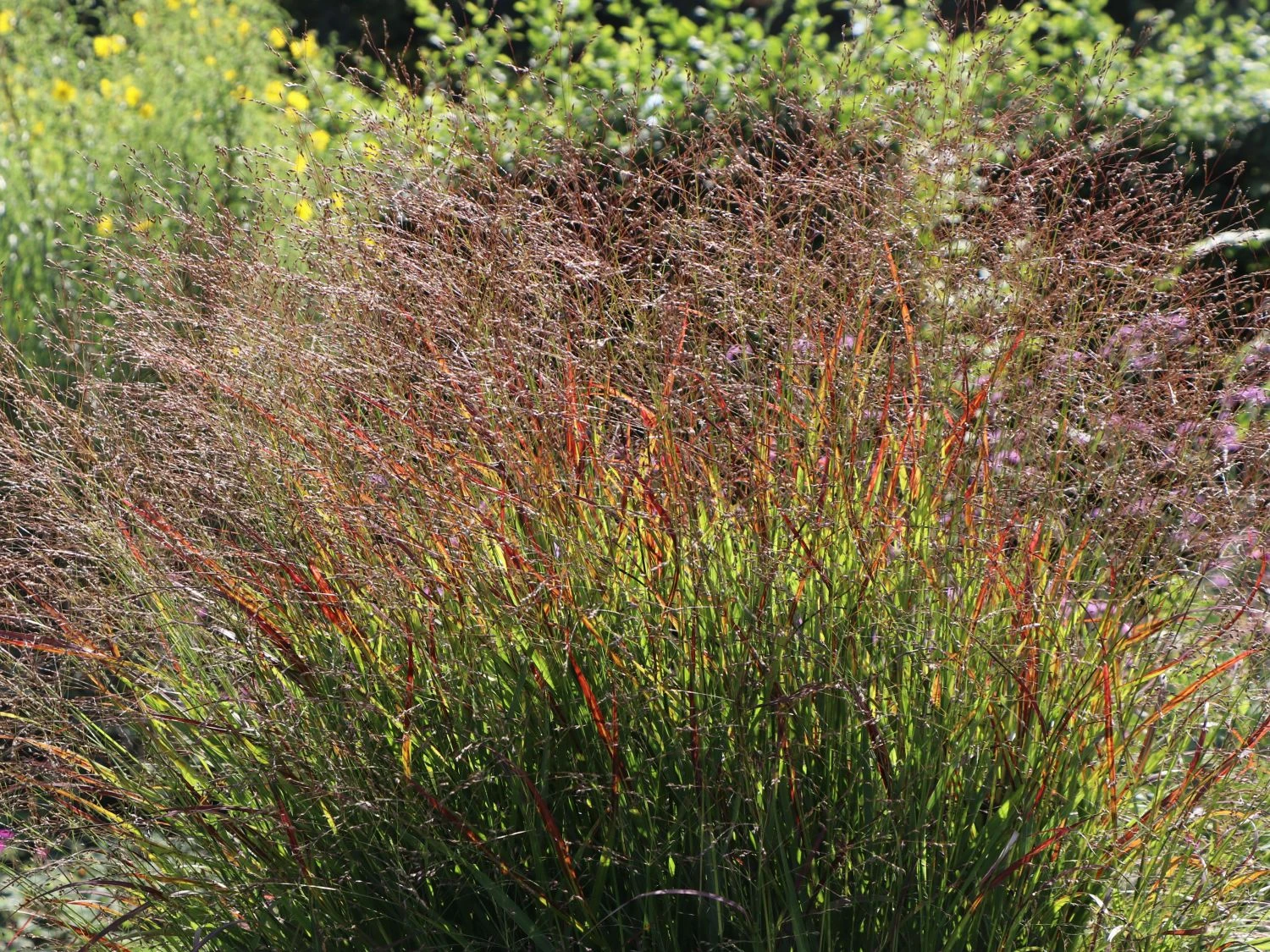 Bis Juli ist das matte, grasähnliche Laub blaugrün mit rötlichen Blattspitzen. Im Anschluss daran hat diese Rutenhirse ihren imposanten und fesselnden Auftritt: Zu dieser Zeit verfärbt sich das Laub in ein spektakuläres Burgunderrot. Mit dieser intensiven und leuchtenden Farbe zieht das Süßgrasgewächs alle Blicke auf sich. An jeweiligen Standort bietet die Rutenhirse ‚Shenandoah‘ somit einen aufregenden Farbkontrast. Im Winter ist es eine ganz besondere Freude, diese Rutenhirse im Schnee zu betrachten. Verwendung findet Panicum virgatum ‚Shenandoah‘ in Beeten, Rabatten und auf Freiflächen mit Wildstaudencharakter. Die lockerhorstig wachsende Rutenhirse ‚Shenandoah‘ bevorzugt die Bereiche in voller Sonne auf einem nährstoffreichen und gut durchlässigen Boden.