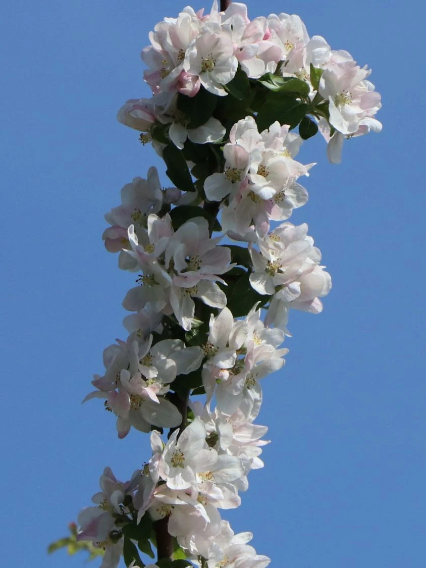 Ende April blüht der Säulenapfel ‚Rondo‘ ® mit dekorativen weiß-rosa Blüten. Apfelbäume liefern deutlich höhere Erträge, wenn eine andere Befruchtersorte in der Nähe steht. Gut eignen sich hierfür andere Säulenapfelsorten wie ‚Pomgold‘, ‚Rhapsodie‘ oder ‚Sonate‘. Bienen und Hummeln lieben Apfelblüten und tragen die Pollen von Baum zu Baum. Malus ‚Rondo‘ ® benötigt einen sonnigen, windgeschützten Standort. Er liebt ein durchlässiges, humoses Substrat aus dem er viele Nährstoffe zieht. Sein Wuchs ist langsam und er behält seine schlanke Säulenform im Alter. Seine Pflege ist einfach. Aufwendige Schnittmaßnahmen entfallen, denn er wächst pro Jahr maximal 30 Zentimeter. Der kleine Obstbaum ist robust und widerstandsfähig gegen die gefürchteten Apfelplagen, sodass keine Pestizide zum Einsatz kommen. In einem heißen Sommer braucht der Säulenapfel ‚Rondo‘ ® reichlich Wasser und im Zweiwochenrhythmus zusätzliche Düngergaben.