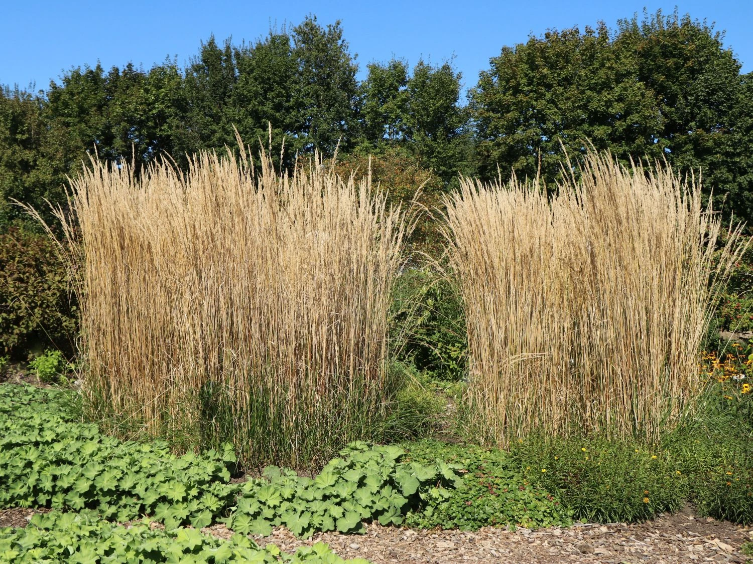 Mit dem rispenartigen, gelbbraunen Blütenstand vermittelt das Sandrohr ‚Karl Foerster‘ beim ersten Anblick pure Natürlichkeit. Die gelbbräunliche Ähre, die sich über die ganze Länge der Pflanze erstrecken kann, ist im getrockneten Zustand eine gute Grundlage für Ziergestecke. Noch leichter zaubern sich Naturfreunde den Garten nicht ins Haus. Aufgrund der flachen Wurzeln ist, in der Umgebung des Sandrohres ‚Karl Foerster‘, Platz für Pflanzen, die sich tief in den Boden verwurzeln. Dennoch steht sie gerne alleine im Boden und es sind nicht mehr als zwei der feinen Pflanze auf einem Quadratmeter zu setzen. Für alle Liebhaber von Gräsern ist das Calamagrostis x acutiflora ‚Karl Foerster‘ die perfekte Grundlage für einen authentischen Grasgarten. Gräser sehen in verschiedenen Höhen kombiniert optisch ansprechend aus. Im Laufe des Jahres ergibt sich ein schönes Farbspiel aus den verschiedenen Grün-, Braun- und Gelbtönen. Dieses Gras ist zu allen Jahreszeiten ein beliebtes Fotomotiv. Im Winter sorgt das Reitgras für ein lebendiges Ambiente in den Farben Grün, Braun und Beige. Auch als Dekoration in der hohen Vase überzeugt diese Sandrohrart. Sie strahlt in jedem Raum Wärme und Natürlichkeit aus. Durch die standfesten Halme lässt sich das hohe Gras in verschiedenen Kombinationen arrangieren. Daher ist es in der Vase bestens mit anderen Gräser und hohen Pflanzen kombinierbar. Besonders apart wirkt das Sandrohr in der Natur zwischen flachen Stauden, die bunt blühen. Diese bunten Blütenteppiche heben sich optisch zwischen den Grasbüschen hervor. Zwischen diesen Blütenteppichen und dem hohen Sandrohr ‚Karl Foerster‘ lassen sich gut Stein- oder Holzwege anlegen. Deshalb ist dieses Gras zur optimalen Gestaltung der großen, verzweigten Gartenanlagen im privaten Bereich ideal geeignet.