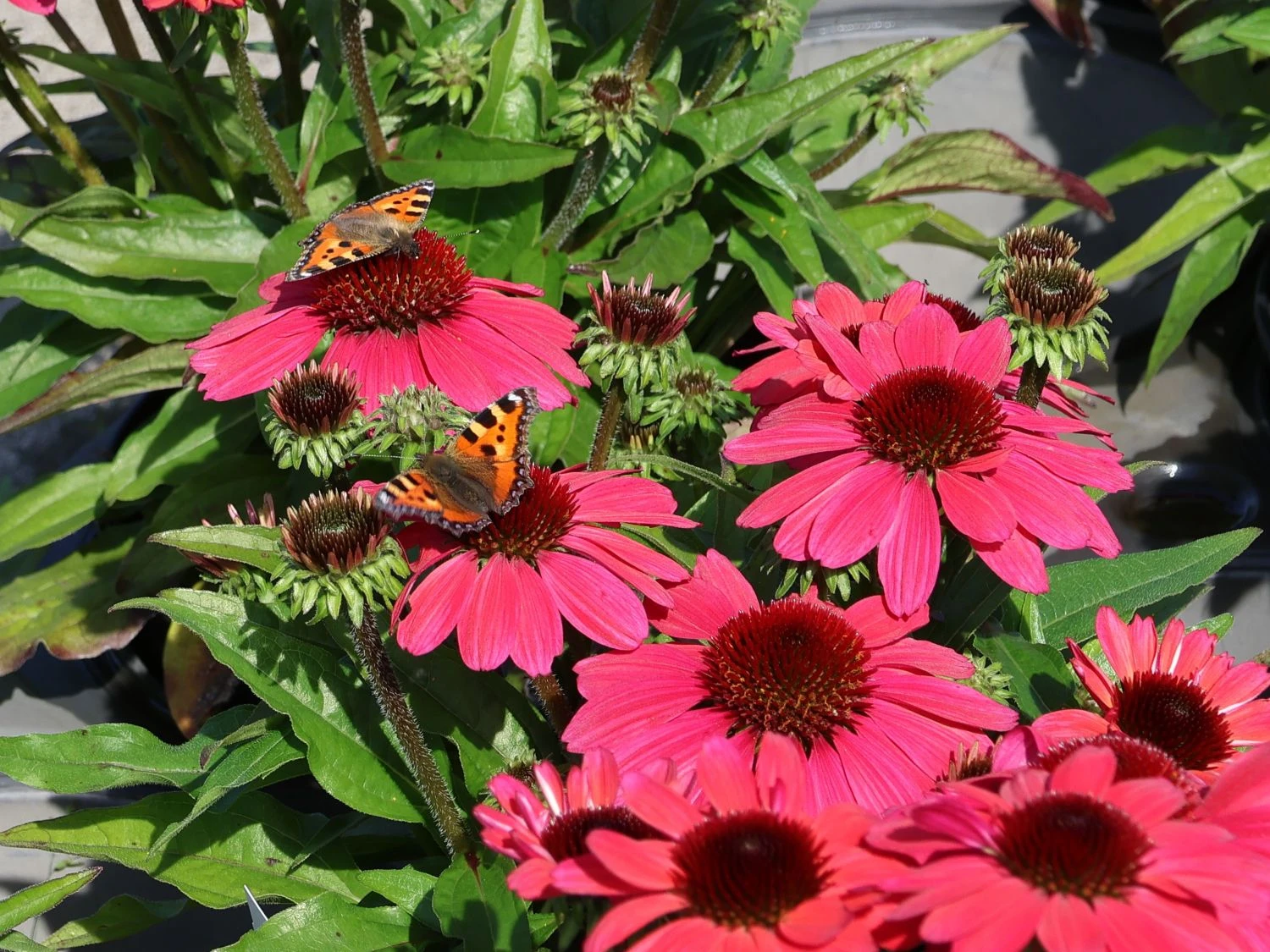 Der Scheinsonnenhut ‚SunMagic Vintage Red‘ ® blüht durch den Sommer hindurch und bezaubert als herrlicher Dauerblüher, der sogar noch bis in den Herbst hinein seine großartigen Blüten zeigt. Der winterharte und mehrjährige Scheinsonnenhut bietet dank seiner guten Winterhärte für viele Jahre fröhliche Farbe im Beet und in anderen Bereichen. Echinacea purpurea ‚SunMagic Vintage Red‘ ® ist eine gute Partnerin anderer Pflanzen. Sie wirkt im gemischten Beet hervorragend neben Pflanzen wie Pampasgras, Schafgarbe oder Sonnenbraut. Alle diese Pflanzen haben die gleichen Ansprüche, sie bevorzugen die sonnigen bis halbschattigen Standorte und einen nährstoffreichen, lockeren, humosen und gut durchlässigen Boden. Die mittelgroßen Blüten von Echinacea purpurea ‚SunMagic Vintage Red‘ ® erreichen einen Durchmesser von etwa fünf bis zehn Zentimeter. Die Pflanze wächst auf 30 bis 45 Zentimeter in der Höhe heran und erreicht eine Breite von 30 bis 40 Zentimeter. Die mittelgrünen Blätter des Scheinsonnenhuts ‚SunMagic Vintage Red‘ ® sind gezähnt und lanzettlich geformt. Da sich die Blüten auch für den Schnitt eignen, kommen sie nicht nur im Beet oder Kübel, sondern auch in der Vase oder im Blumenstrauß wunderschön zur Geltung.