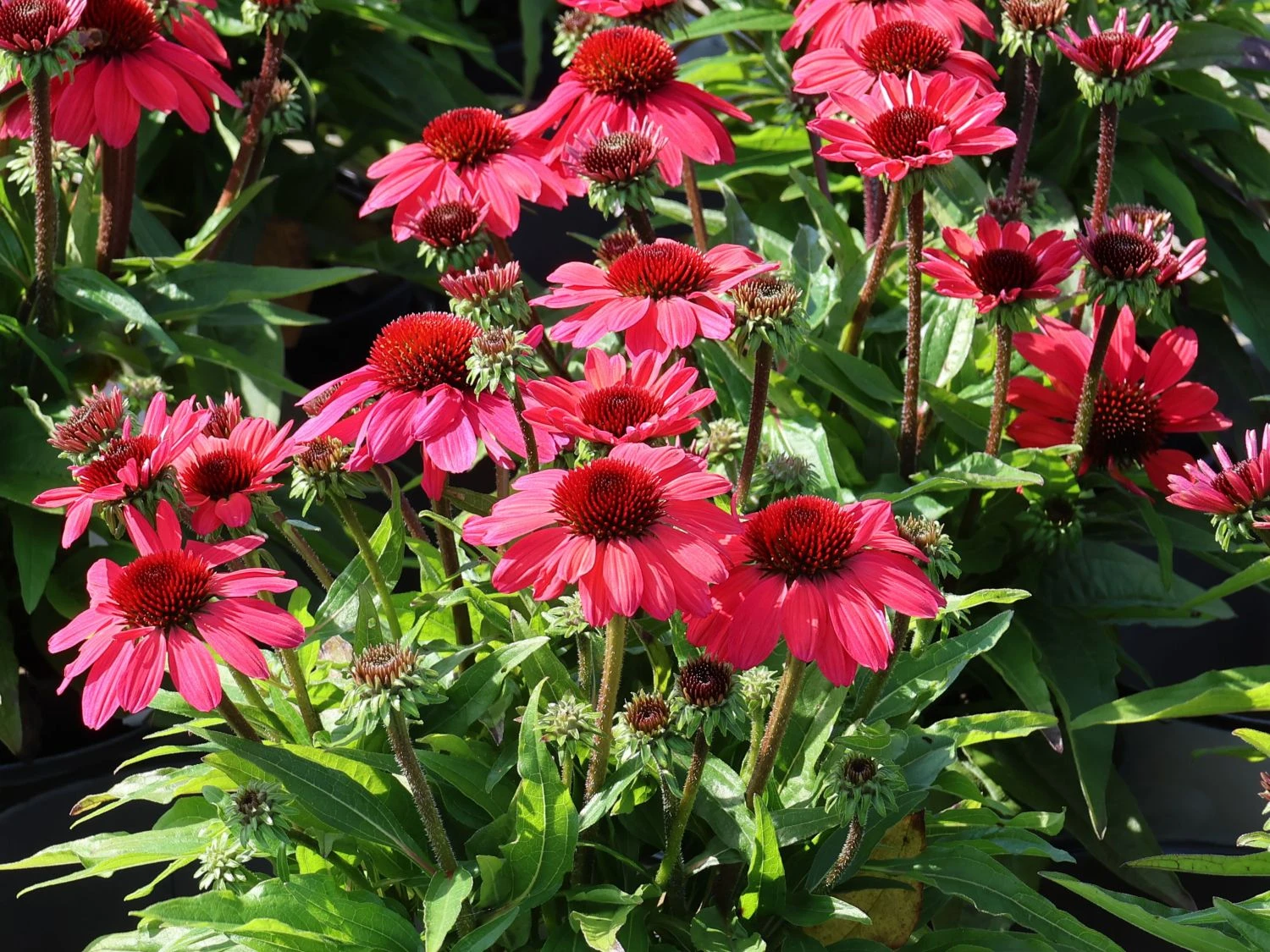 Der Scheinsonnenhut ‚SunMagic Vintage Red‘ ® sorgt in der Zeit von Juli bis September große Freude im Blumenbeet. Ganz besonders durch den auffallenden Blütenschmuck, der sich durch den ganzen Sommer hindurch präsentiert. Die wunderschönen Blüten, die in ihrem strahlenden Rot auffallen, sind begehrte Futterquelle von Bienen und Hummeln. Jeder der dunkelgrünen Stängel trägt an seinem oberen Ende eine Blüte. Im schönsten Hochsommer zeigen sich eine Vielzahl an Blüten und (bot.) Echinacea purpurea ‚SunMagic Vintage Red‘ ® bereichert das Staudenbeet. Auf dem Balkon oder auf der Terrasse ist diese großartige Pflanze im Kübel oder Topf zu bewundern. Die Pflanze wächst gut verzweigt und entwickelt sich herrlich kompakt. Dank des Wuchses, eignet sich der Scheinsonnenhut ‚SunMagic Vintage Red‘ ® ideal zum Bepflanzen von Kübeln oder als schmucker Farbtupfer in kleineren Gärten. Während das intensive Rot der Blüten für eine aufregende Optik sorgt, locken die einfachen Blüten zudem Bienen, Hummeln und andere Insekten an. Sie fühlen sich vom zarten Duft des Nektars magisch angezogen. Durch das regelmäßige Das regelmäßige Entfernen verblühter Blütenstände verlängert die ohnehin schon sehr lange Blütezeit. Der Sonnenhut ist in seiner natürlichen Umgebung an trockene und sonnige Bereiche gewöhnt, daher sind ein paar regenfreie Tage für die Pflanze gut auszuhalten.