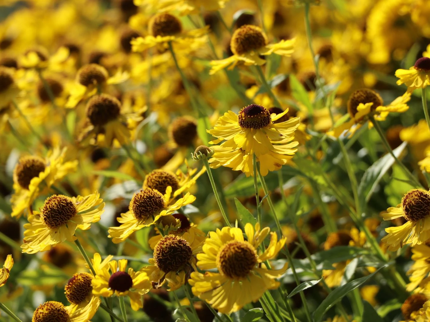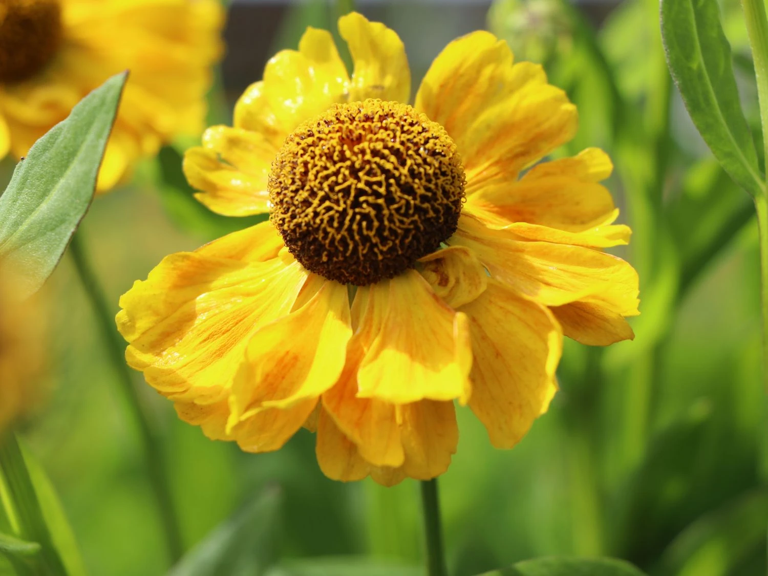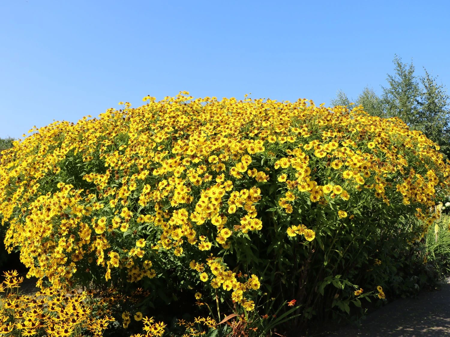 Die Sonnenbraut ‚Goldrausch‘ ist eine wirklich erstaunliche Blume. Sie erreicht eine Höhe von bis zu 150 Zentimetern und überragt andere Stauden damit um Längen. Man könnte die Pflanze mit Ihren lanzettlich geformten und gezähnten Blättern also als Hüne unter Ihren Verwandten bezeichnen. Trotz Ihrer Höhe wächst die Sonnenbraut ‚Goldrausch‘ (bot. Helenium x cult. ‚Goldrausch‘) aufrecht. Ihren Namen trägt sie aufgrund der schönen goldgelben Blüten, die herrlich in der Sonne leuchten. Im Schatten steht die Pflanze weniger gern, doch dort würde das strahlende Gelb auch gar nicht angemessen in Szene gesetzt werden.