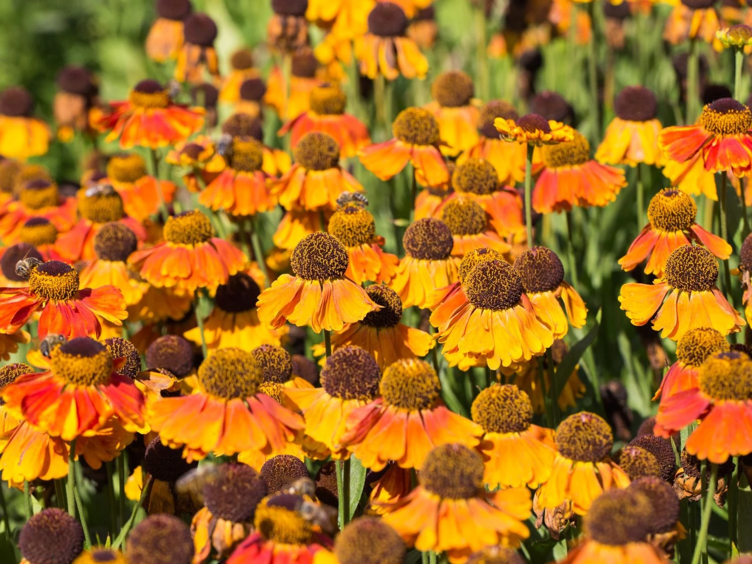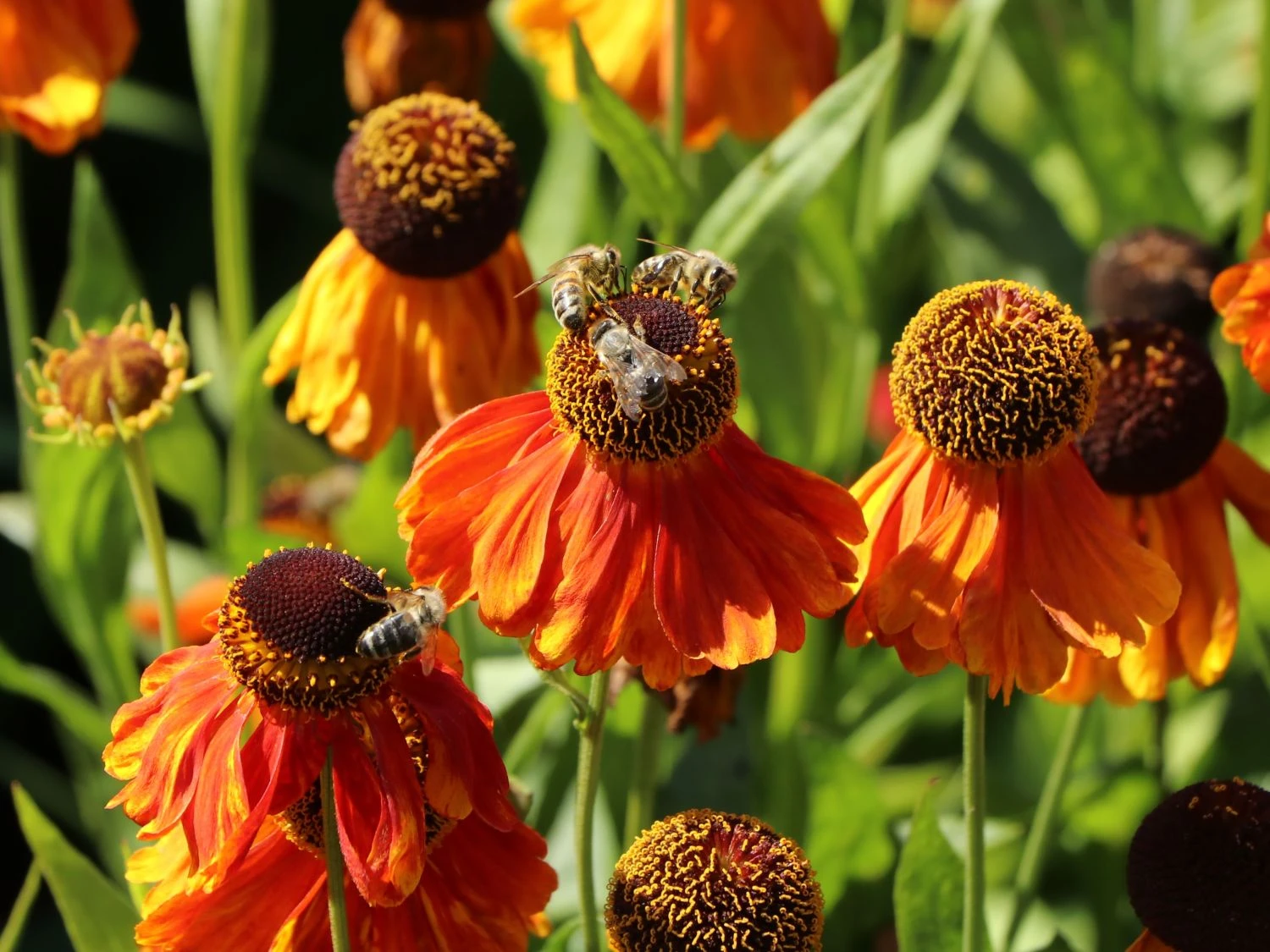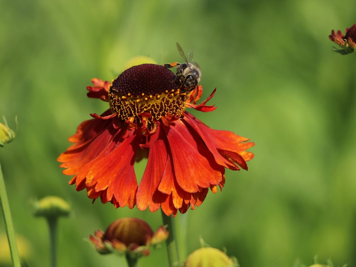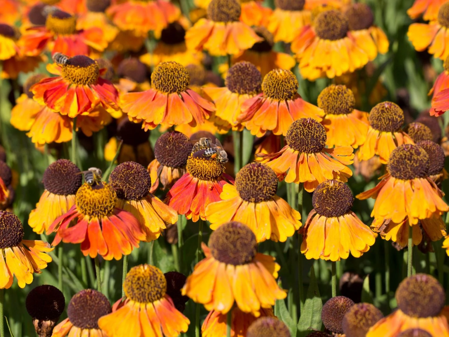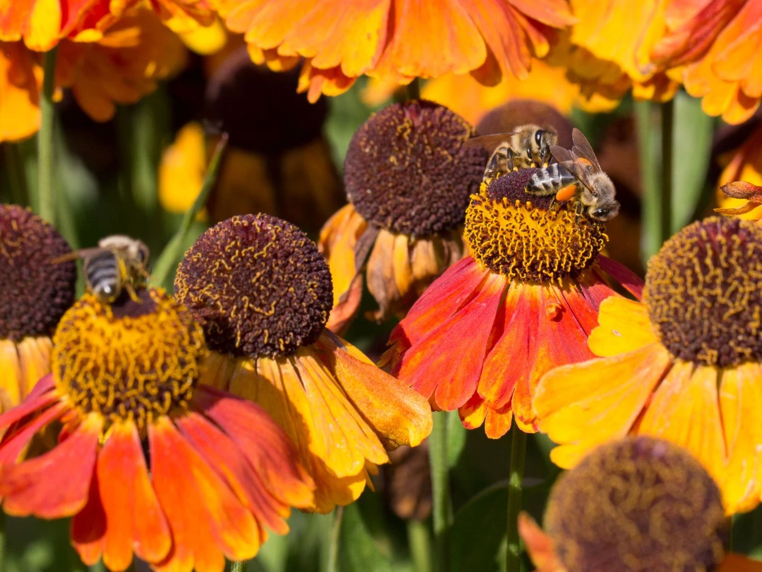 Deshalb eignet sie sich auch hervorragend zur Bepflanzung für eine Bienenweide, die der Imker gerne anlegt, weil er sein Volk dann immer bestens versorgt weiß. Aber auch, wenn man kein Imker ist, kann eine solche Bienenweide durchaus eine erfreuliche Bereicherung der dekorativen Ecken im Garten sein. Schon die sagenhaften Farben der Helenium x cult. ‚Sahin’s Early Flowerer‘ ® – wie die Sonnenbraut mit ihrer botanischen Bezeichnung auch noch genannt wird – machen diese Staude zu einem wahren Schatz, die seit Jahren überaus beliebt ist. Jede einzelne Pflanzen der Staude werden innerhalb von 2 – 3 Jahren atemberaubende Farbkontraste zum Vorschein bringen, die sich mit hohen Pflanzen wie den Rittersporn oder tollen Gräsern zu einer fantastischen Landschaft gruppieren lassen.